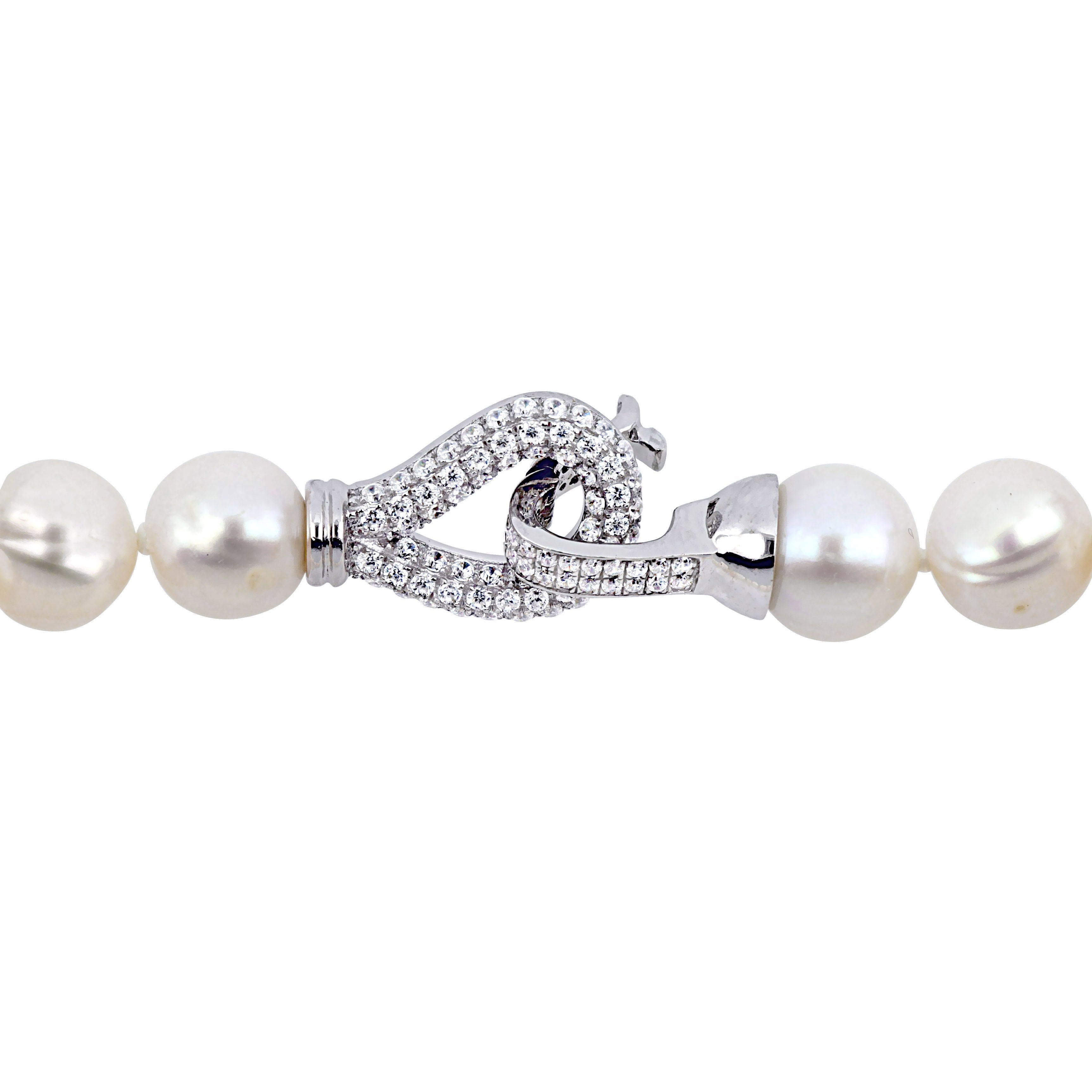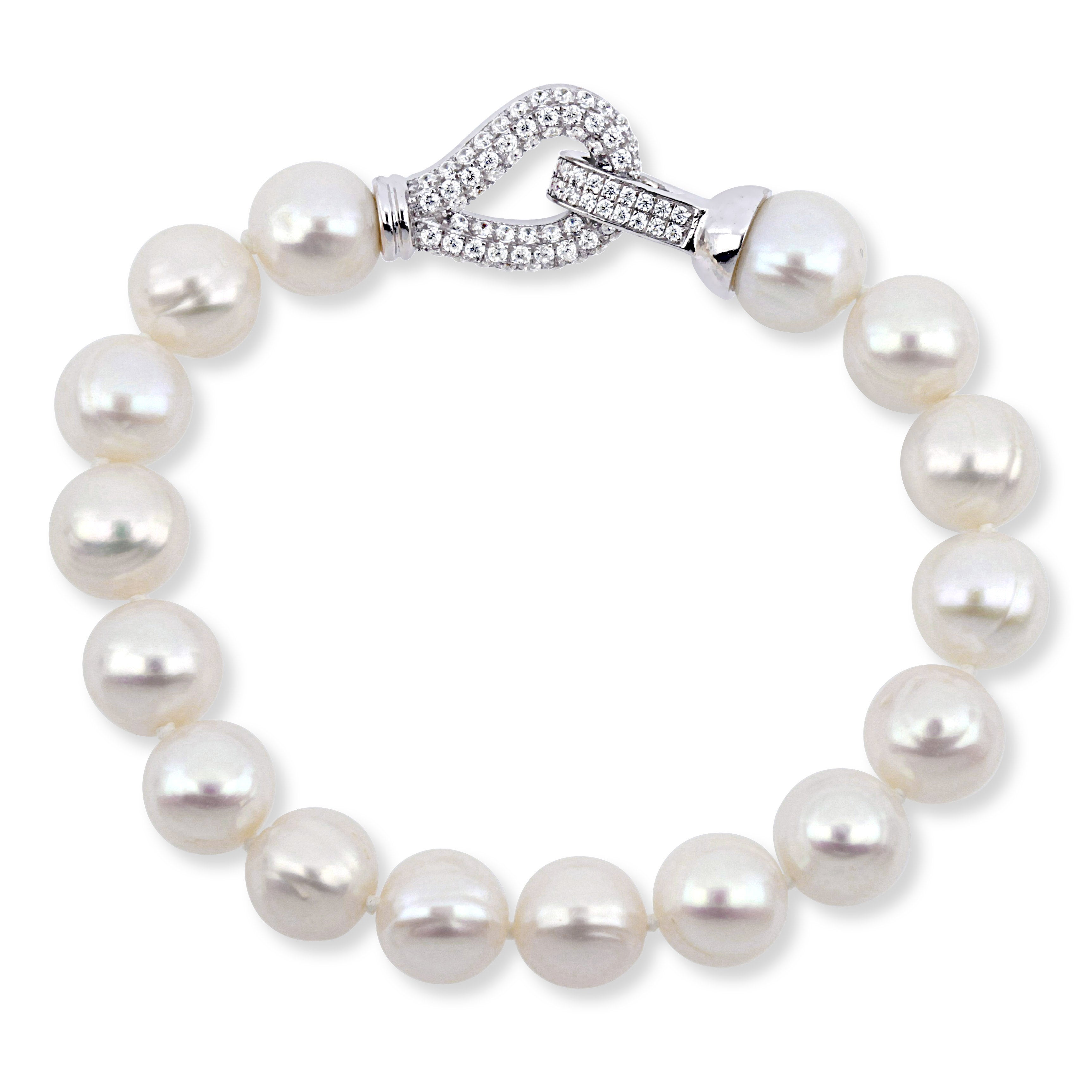 Every pearl lover will fall in love at the first sight of this mesmerizing bracelet. Crafted in lustrous sterling silver, this classic bracelet showcases a strand of 9-10mm off round-shaped cultured freshwater pearls. This 7.5-inch elegant bracelet is comfortably secured with enhancer clasp featuring cubic zirconia gemstones. Polished to brilliance, this enchanting bracelet is a timeless treasure.