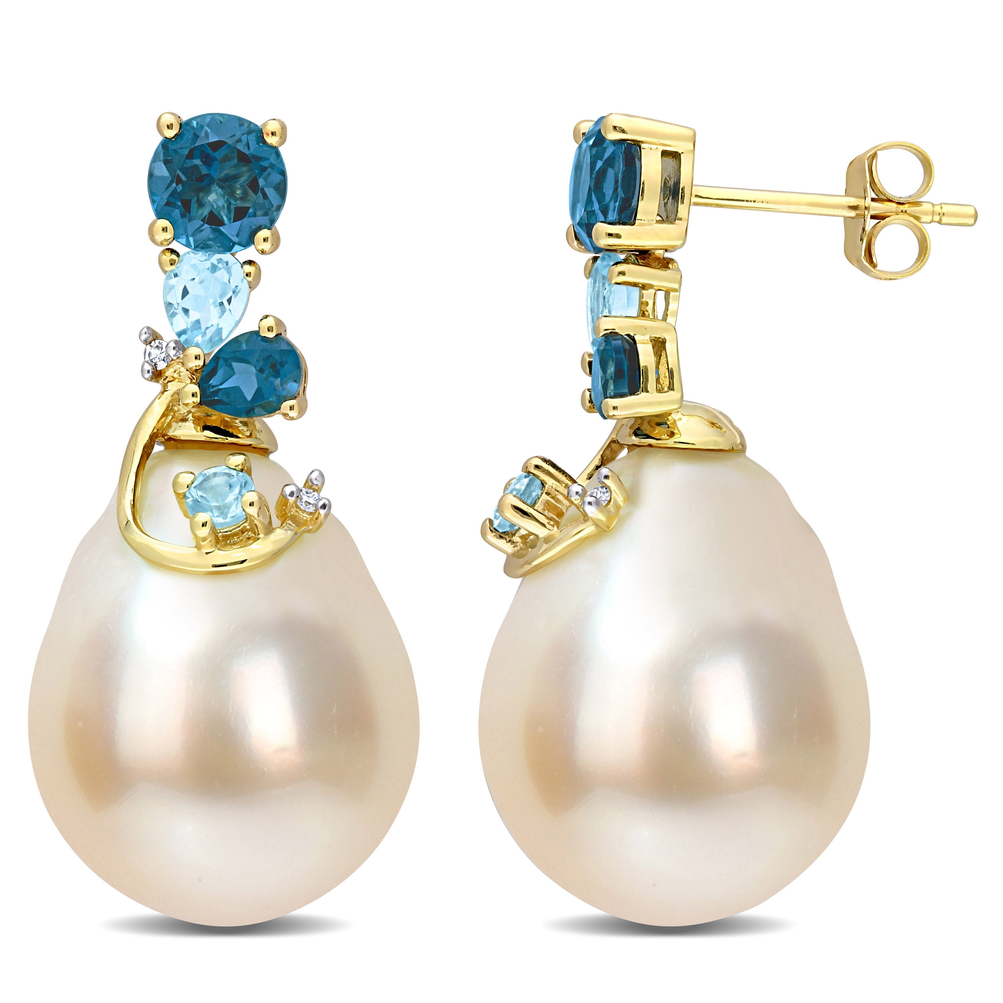 Cultured South Sea Pearl & Blue Topaz with Diamond Accent Drop Earrings in 14k Yellow Gold