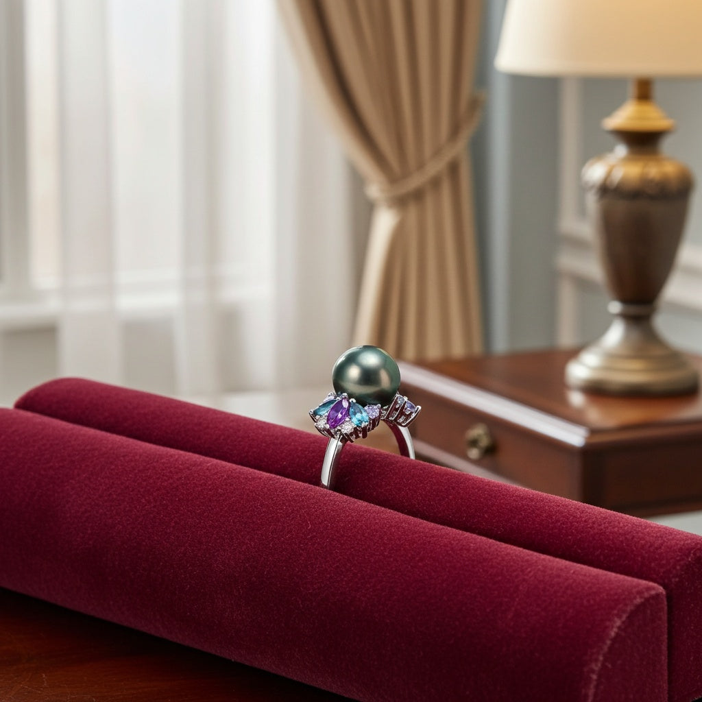 Cultured Tahitian Pearl & Multi-Gem Cluster Floral Ring in Sterling Silver