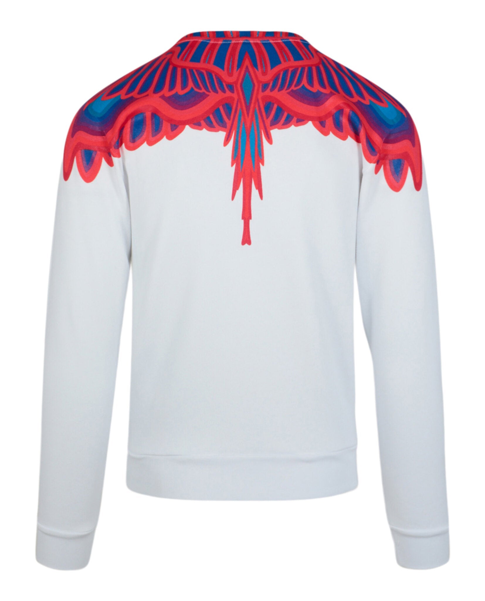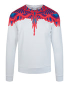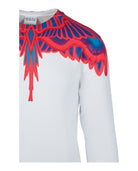 Make a bold statement with the Marcelo Burlon Curves Wings Crewneck Sweatshirt. This striking piece features the brand's signature curved wings graphic in vibrant red and blue, dramatically printed across the shoulders and neckline for an eye-catching look.