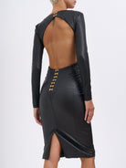 The dress is elevated by distinctive gold-tone metal hook details that add a touch of glamour and edge to the design. The knee-length cut creates an elegant proportion that's perfect for evening events.