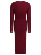 Self-portrait cut-out midi dress made of stretchy ribbed knit. The structure features an elongated silhouette with cut-out details at the front and draped shoulders. Applied buttons on the skirt allow you to modulate the width of the slit. The fabric is fitted and follows the line of the body, offering a defined fit. Construction elements highlight ribbed knitting and front-positioned cut-outs.