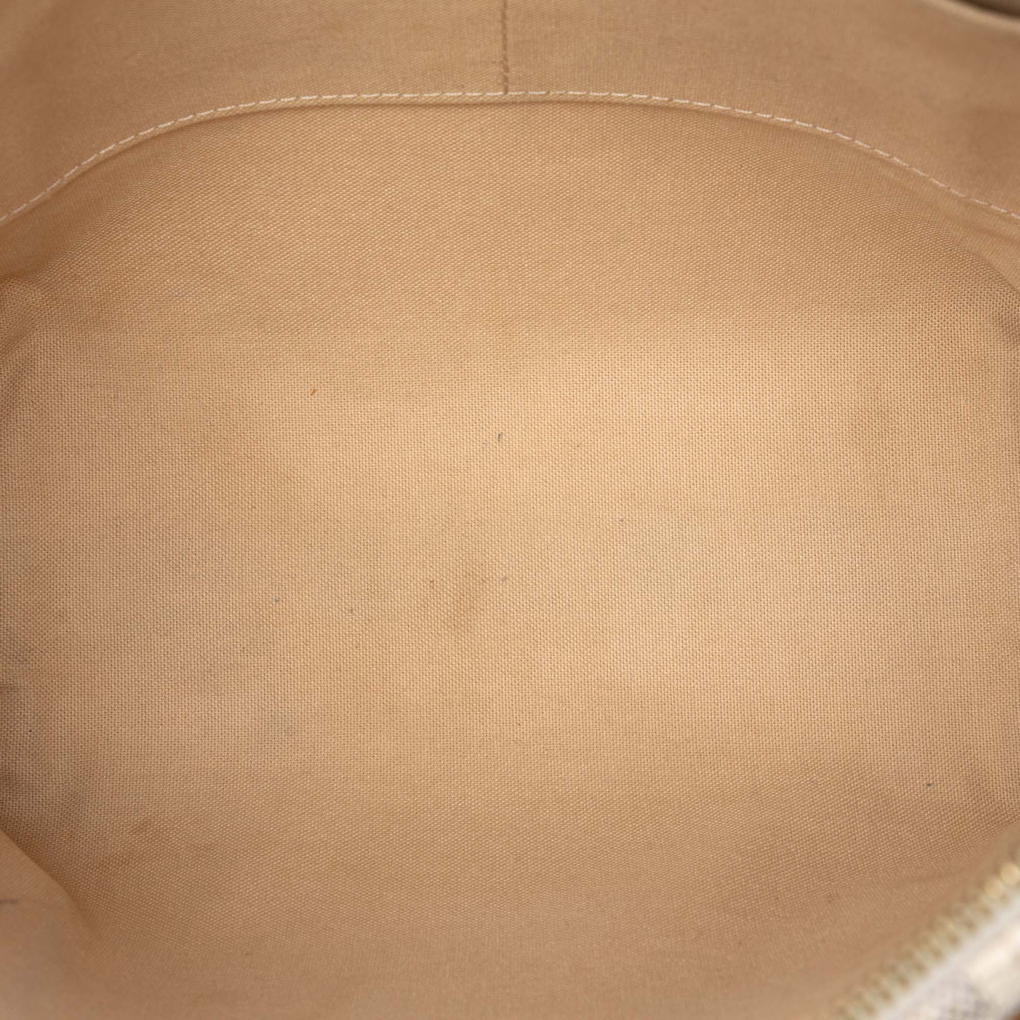 The Totally PM features a damier azur canvas body with vachetta leather trim, flat vachetta leather handles, a top zip closure, exterior side slip pockets, and an interior slip pocket.