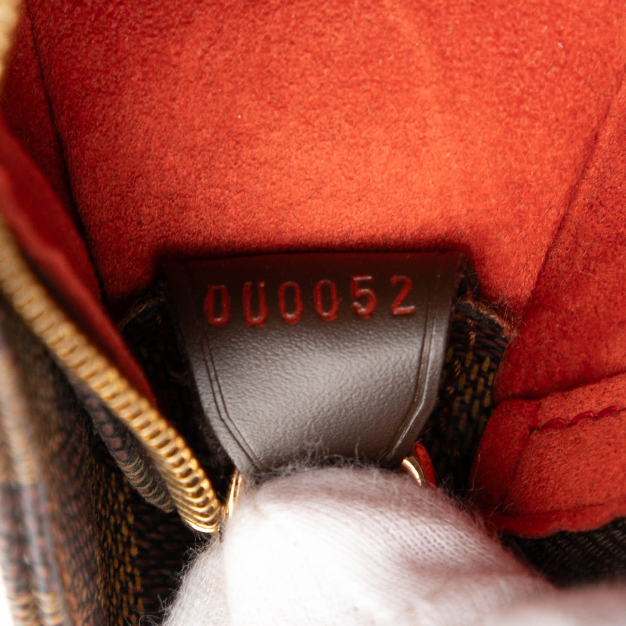 The Looping GM features a damier ebene canvas body, a rolled leather strap, a top zip closure, and interior open and zip pockets.