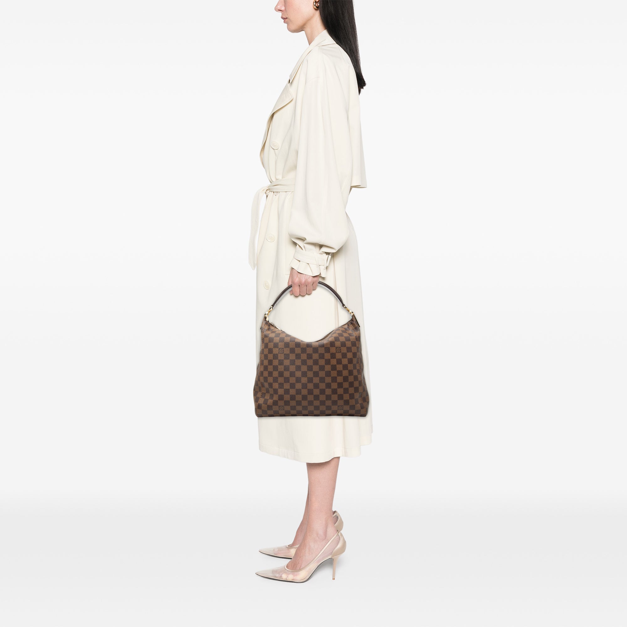The Portobello PM features a damier ebene canvas body, a flat leather strap, a top zip closure, and interior zip and slip pockets.
