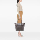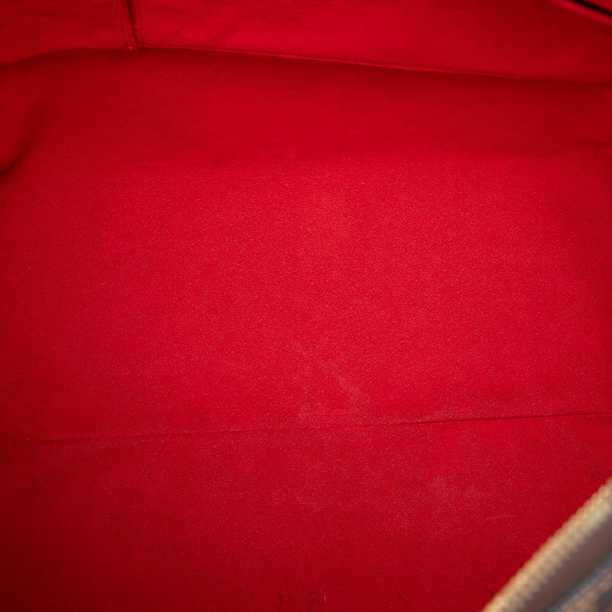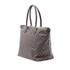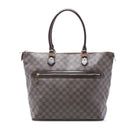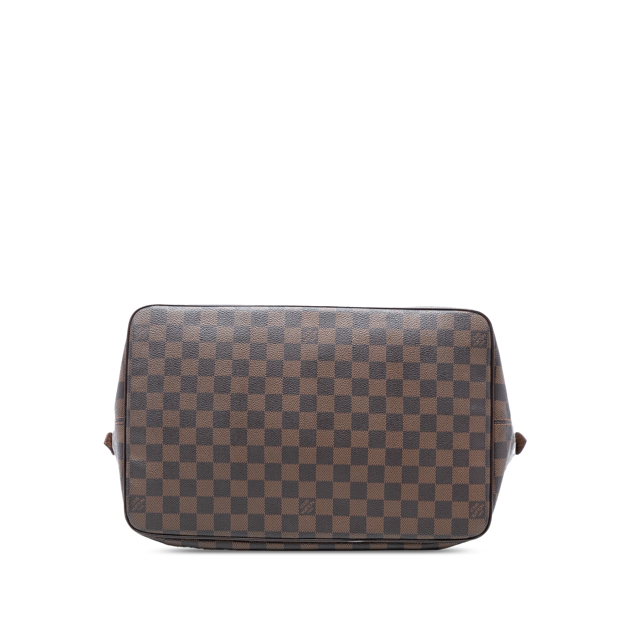 The Saleya GM features a damier ebene canvas body, an exterior front zip pocket, rolled leather straps, a top zip closure, and an interior zip pocket.