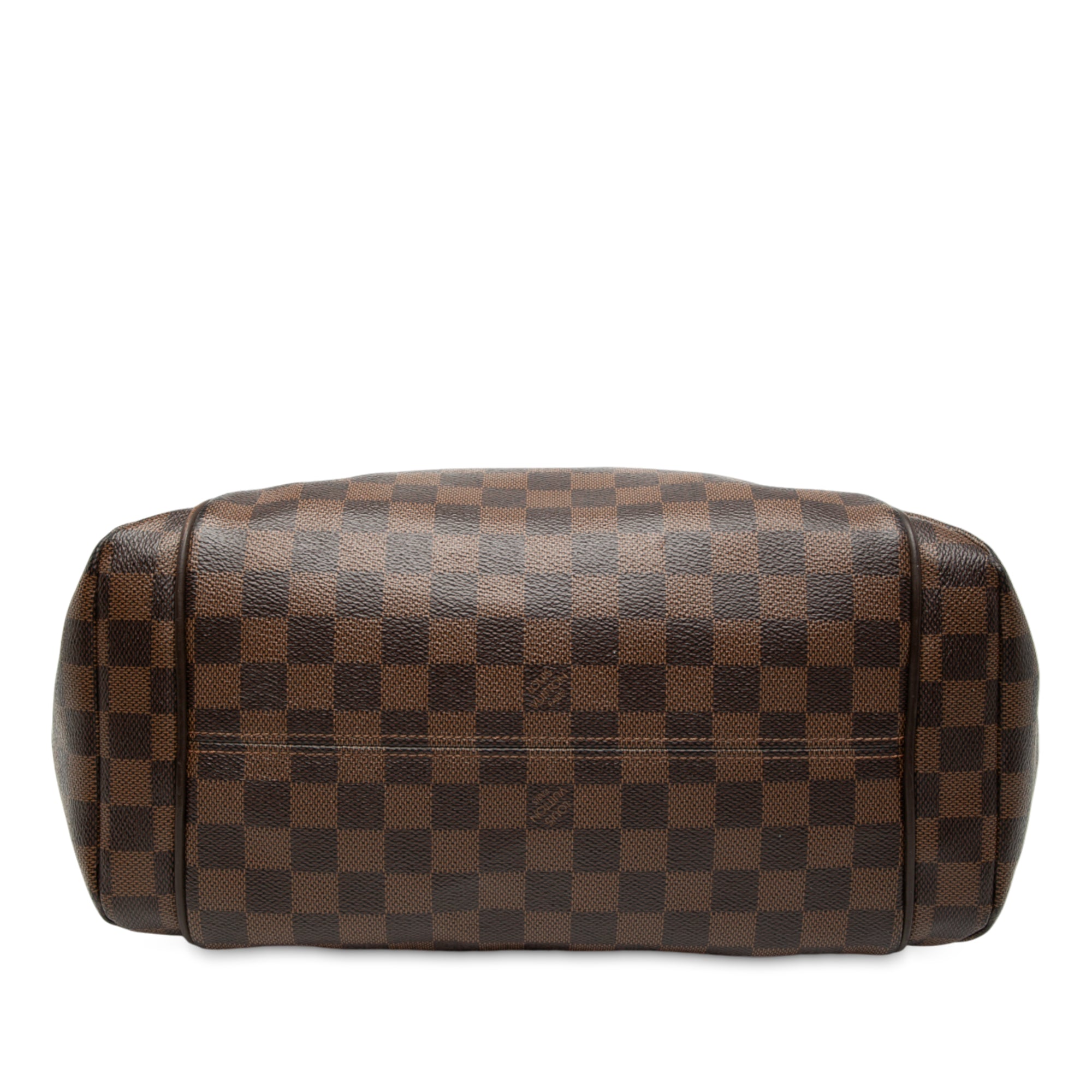 The Totally MM features a damier canvas body with leather trim, flat leather straps, a top zip closure, exterior side slip pockets, and interior slip pockets.