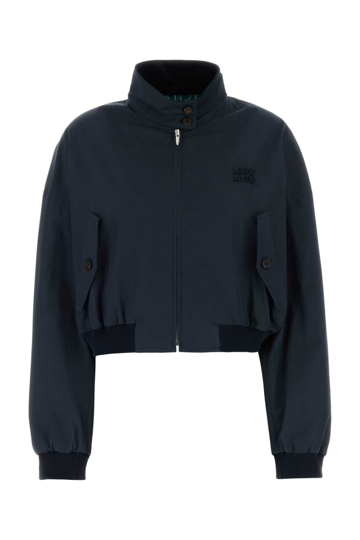 Elevate your outerwear collection with this sophisticated dark blue bomber jacket from Miu Miu. Crafted from a premium cotton blend, this cropped silhouette features classic bomber styling with ribbed collar, cuffs, and hem, along with functional front pockets for a sporty-chic aesthetic.