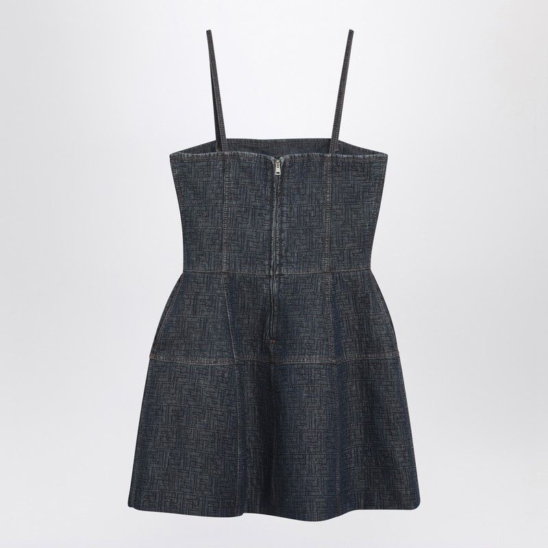 Elevate your warm-weather wardrobe with this stunning Dark Blue FF Denim Bustier Dress by Fendi. Crafted from premium dark blue denim, this short dress features the iconic quilted FF motif throughout, showcasing the house's signature luxury aesthetic. The structured bustier bodice with delicate straps creates a flattering silhouette, while the playful balloon skirt adds volume and movement. Finished with contrasting tobacco-colored stitching and a concealed back zip closure, this piece effortlessly transitions from daytime chic to evening glamour. Style it with strappy heels and minimal jewelry for a sophisticated night out, or dress it down with sneakers for an elevated casual look.