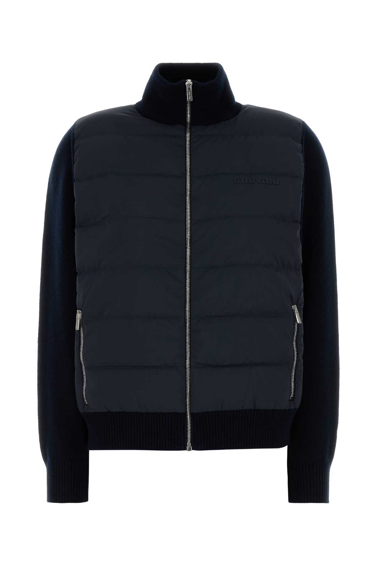 Elevate your everyday wardrobe with this sophisticated Dark Blue Stretch Cashmere Blend Jacket from Miu Miu. This innovative hybrid design features a quilted padded body paired with luxuriously soft knit sleeves, creating the perfect balance between sporty functionality and refined elegance.