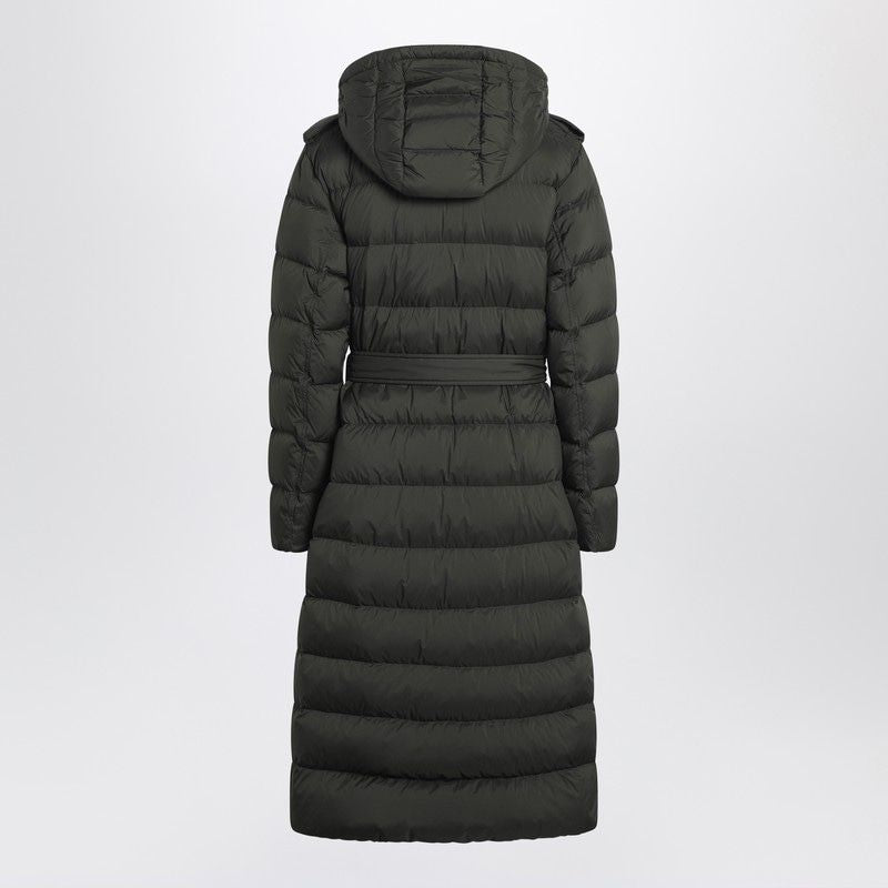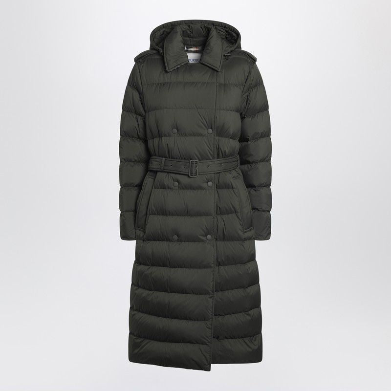 Embrace effortless sophistication with this luxurious dark green padded coat from Burberry. Crafted from premium nylon with quilted padding, this double-breasted design features an adjustable waist belt that creates a flattering silhouette while providing exceptional warmth.