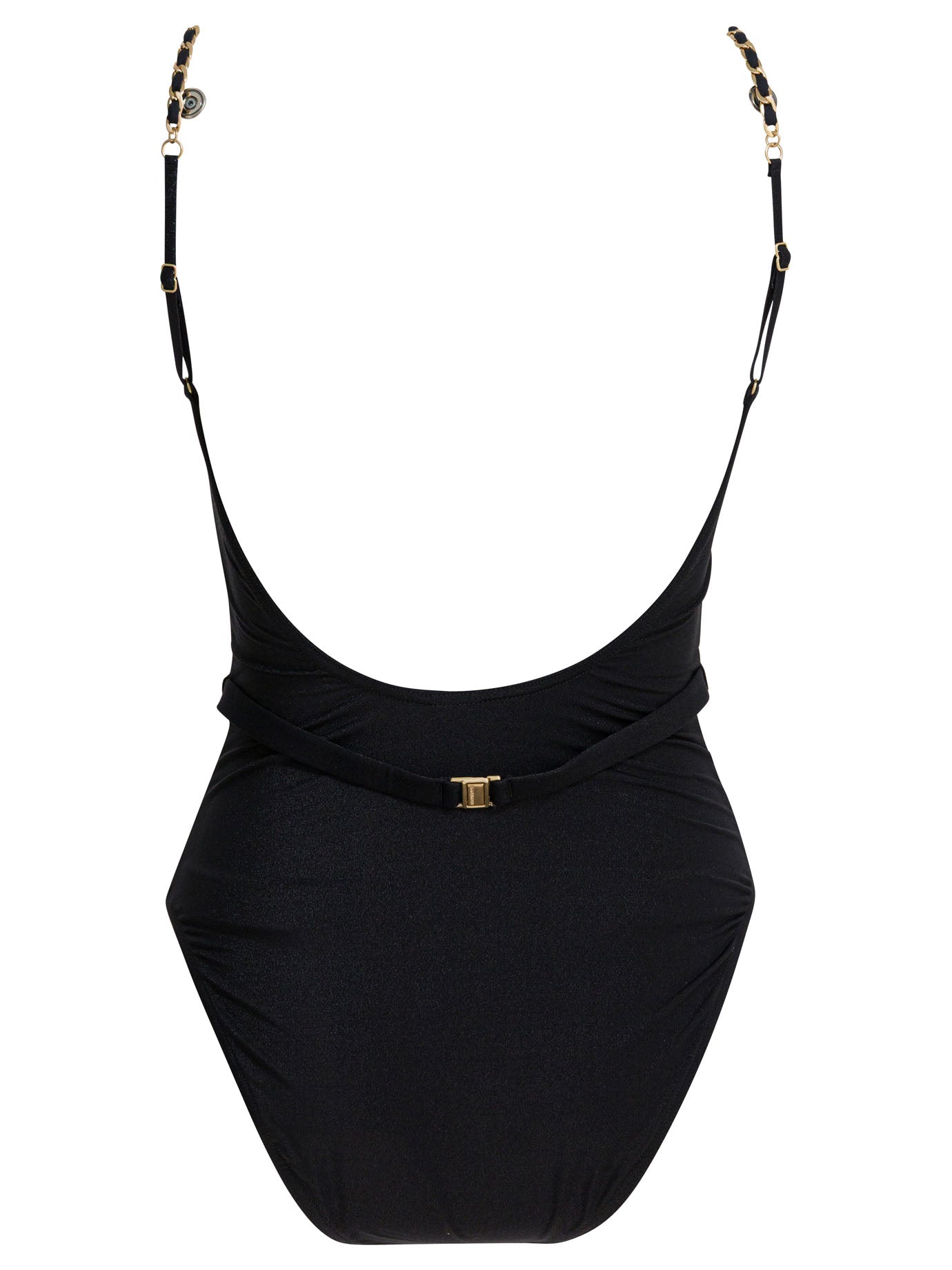 Crafted in a timeless solid black colorway with a regular fit, this swimsuit offers both comfort and confidence for all-day wear. The eye-catching chain embellishments create a striking focal point while maintaining a refined aesthetic.