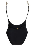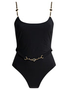 Zimmermann stretch-fabric "Daylight Chain Scoop" swimsuit, fitted structure with round neckline and attached waist strap. Thin straps feature integrated metallic details. The silhouette adheres to the body, supported by a technical composition that includes polyamide, metallic fibers and elastane, resulting in a stable fit and an even all-over profile. Construction elements emphasize support and structural linearity.