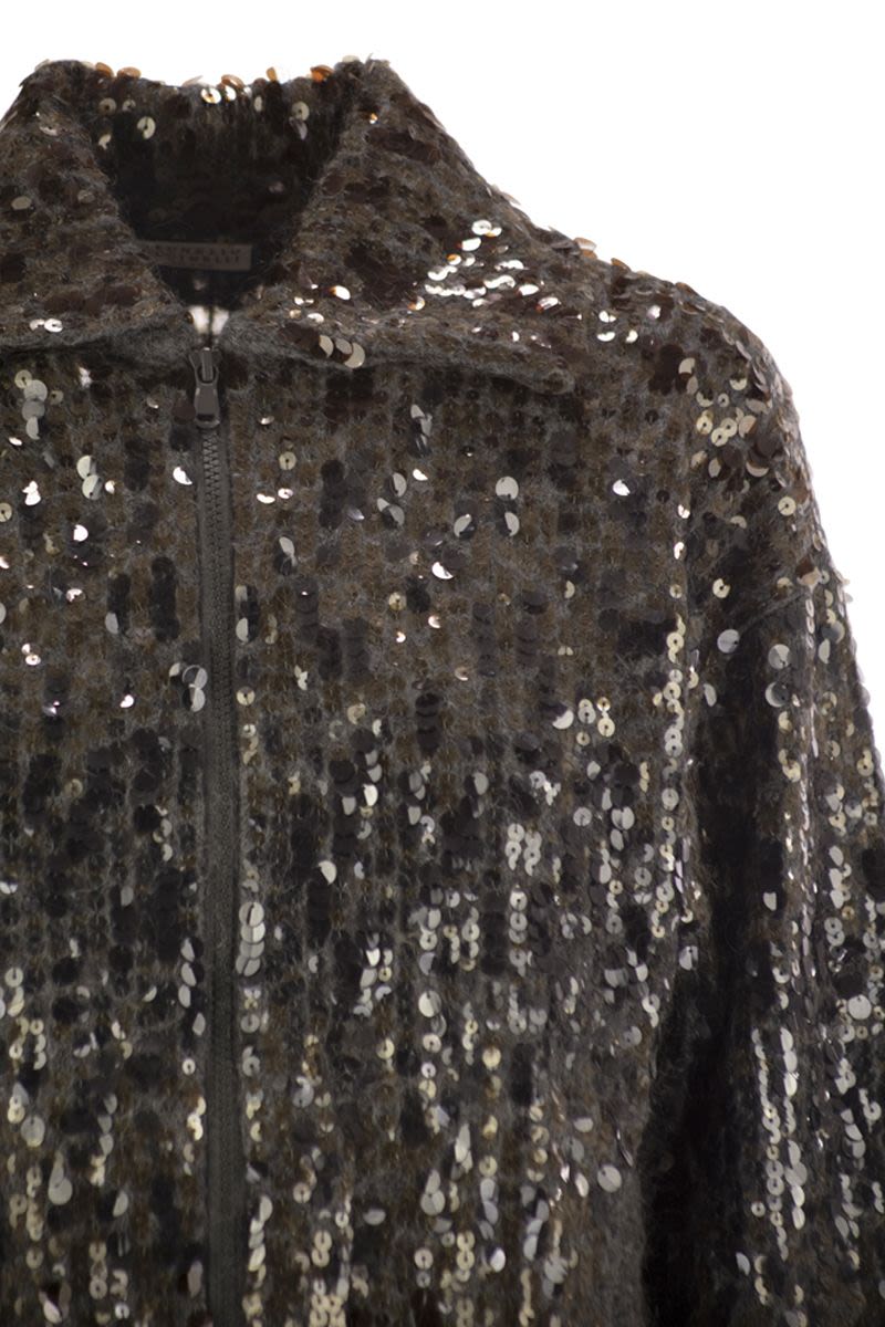 PRECIOUS EMBROIDERY AND FINE MATERIALS EMBELLISH THE NEW DAZZLING DéGRADé EMBROIDERY CARDIGAN IN MOHAIR AND WOOL. A BRILLIANT CASCADE OF SEQUINS IN DIFFERENT NUANCES ILLUMINATES THE SURFACE OF THE GARMENT WITH ITS REFLECTIONS CREATING A SHADED DESIGN. THE EMBROIDERY IS APPLIED ON A MOHAIR AND WOOL NET KNIT BASE, GIVING THE MODEL A FLUFFY AND SOFT APPEARANCE. THE ZIP FASTENING COMPLETES THE CARDIGAN WITH A FUNCTIONAL ELEMENT. THE MODEL FEATURES A REFINED DéGRADé EMBROIDERY MADE OF SEQUINS IN TWO COLOURS: A TONE-ON-TONE BASE SHADE AND A CONTRASTING SHADE. TOGETHER, THESE TWO NUANCES CREATE A SOPHISTICATED AND LUSTROUS SHADE. THE EMBROIDERY IS MADE ON A MESH KNIT BASE OF GAUZE MOHAIR AND WOOL, AND IS WORKED VERTICALLY TO PRESERVE THE STRUCTURE AND ELASTICITY OF THE GARMENT. - ZIP AND DOUBLE-SLIDER CLOSURE - DROPPED SHOULDER - WIDE SLEEVE - LOW POCKETS - SPECIAL WORKMANSHIP DESIGNER ID: M1U375916 C9144