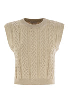 FEMININE LINES COMBINE WITH FINE BRUNELLO CUCINELLI YARNS IN THE DAZZLING DOUBLE CABLE KNIT WAISTCOAT. THE SOPHISTICATED DOUBLE CABLE KNIT IS ENHANCED BY THE LIGHTWEIGHT YARN, ENRICHED WITH DELICATE SEQUINS THAT SPREAD LUMINOUS NOTES THROUGHOUT THE GARMENT. THE SILHOUETTE PRESENTS JUXTAPOSED LINES, WITH SEMI-SHEER SHOULDERS. THE WORKMANSHIP OF THE LIGHTWEIGHT DIAMANTE YARN COMBINES THE FRESH AND NATURAL TOUCH OF PURE COTTON WITH SMALL SEQUINS CAGED IN THE YARN, WHICH DIFFUSE DELICATE SHINY REFLECTIONS ON THE SURFACE OF THE GARMENT. - ROUND NECK - REGULAR SHOULDER - REGULAR SLEEVE - BRAIDED KNIT DESIGNER ID: MDV798130 C9733
