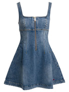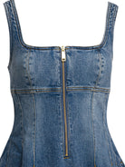 Self-portrait denim flared dress with stretch denim construction and structured fabrication. Pattern features a fitted waist silhouette with corset top and wide, flared mini hem. Exposed front zipper closure, positioned logo embroidery. Fabric is slightly stretchy for a stable fit and conforms to the anatomical shape. Sleeveless structure designed to outline the figure.