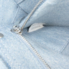 The Cassette features a denim body, an adjustable flat denim shoulder strap, a flap with push lock closure, and an interior zip pocket.