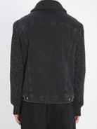 Padded jacket in cotton denim and wool blend in black color. Features double collar in wool and denim, front panel and sleeves in wool, double closure with buttons and zipper, two vertical flap pockets with buttons and two welt pockets with buttons on the front, logo appliqué on the chest, back buttons on the hem to adjust the waist fit. Regular fit.