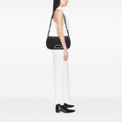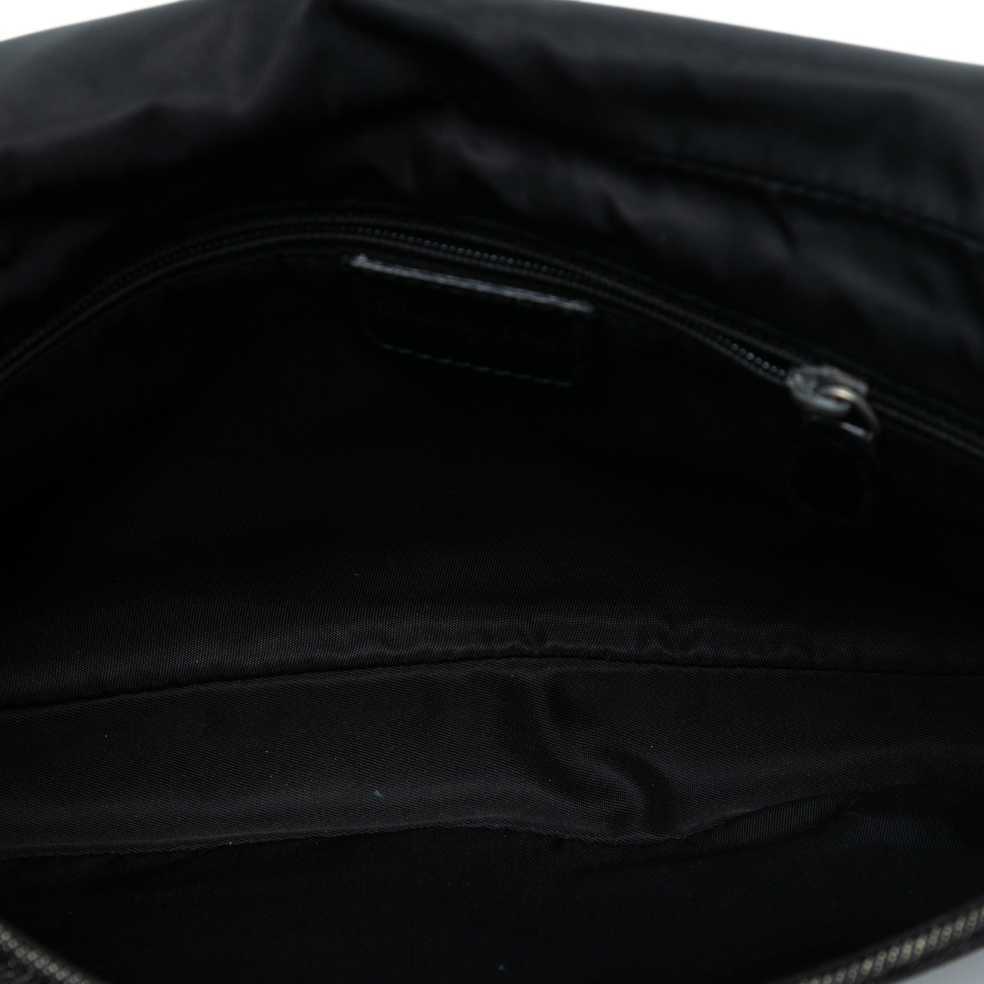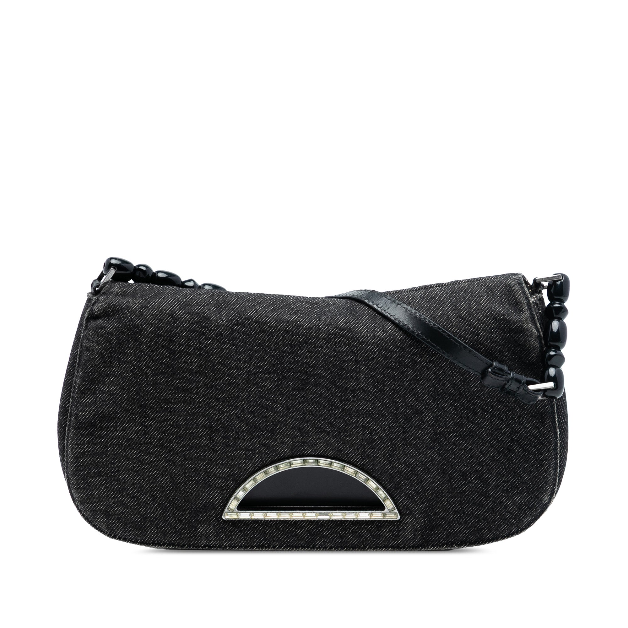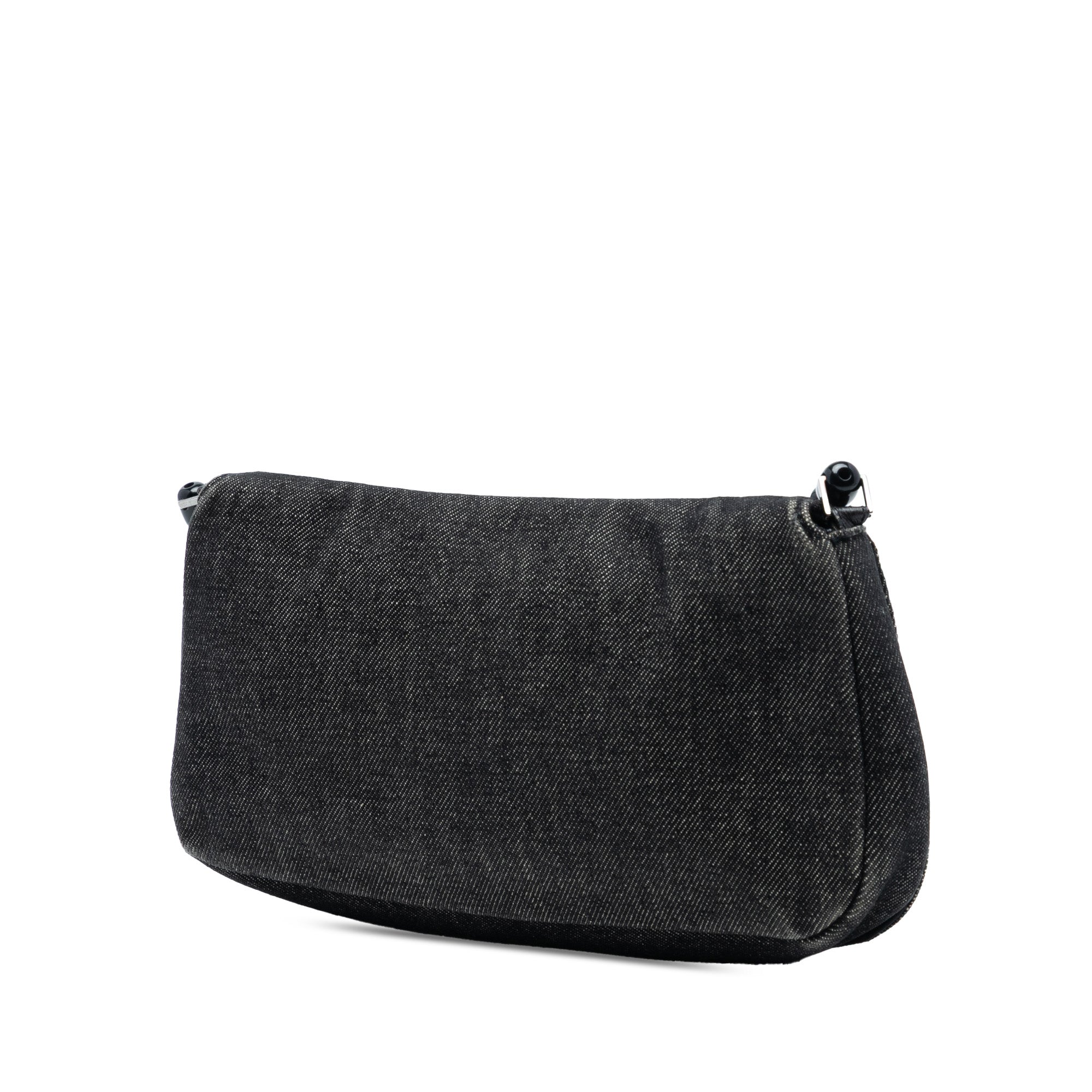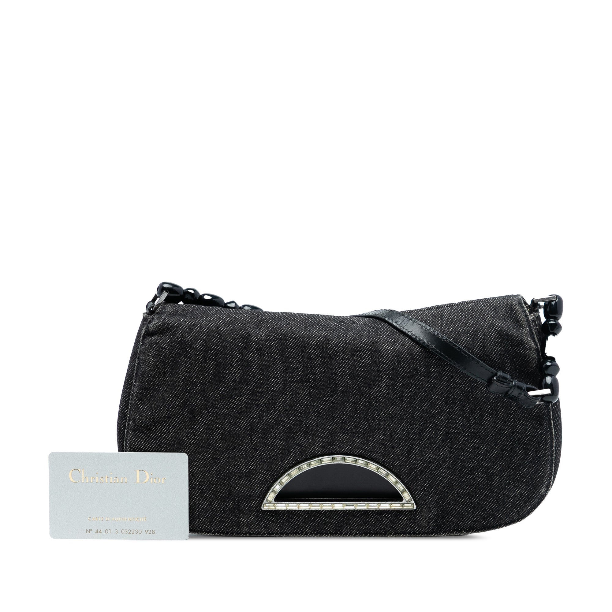 This Malice features a denim body with leather trim, a flat leather strap, a front flap with magnetic snap closure, and an interior zip pocket.