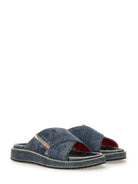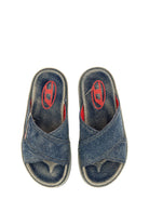 DENIM SLIDES WITH CRISS CROSS STRAPS