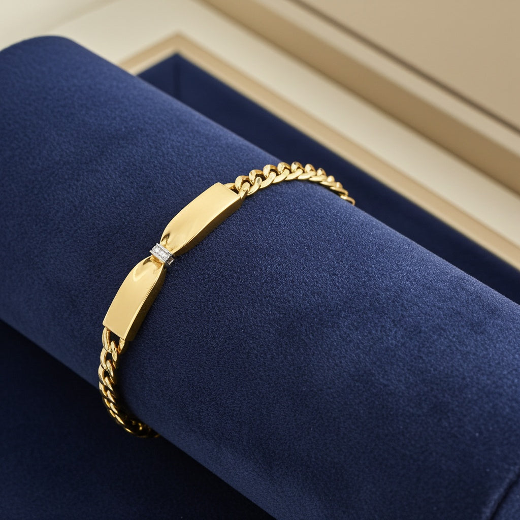 This charming bow bangle, beautifully crafted in 14k yellow gold, is adorned with diamond accents, creating an exquisite and fashionable accessory. The bow design adds a touch of elegance to any ensemble, and the inclusion of the box chain enhances its appeal. With its delicate yet stylish appearance, this bangle is a versatile choice.
