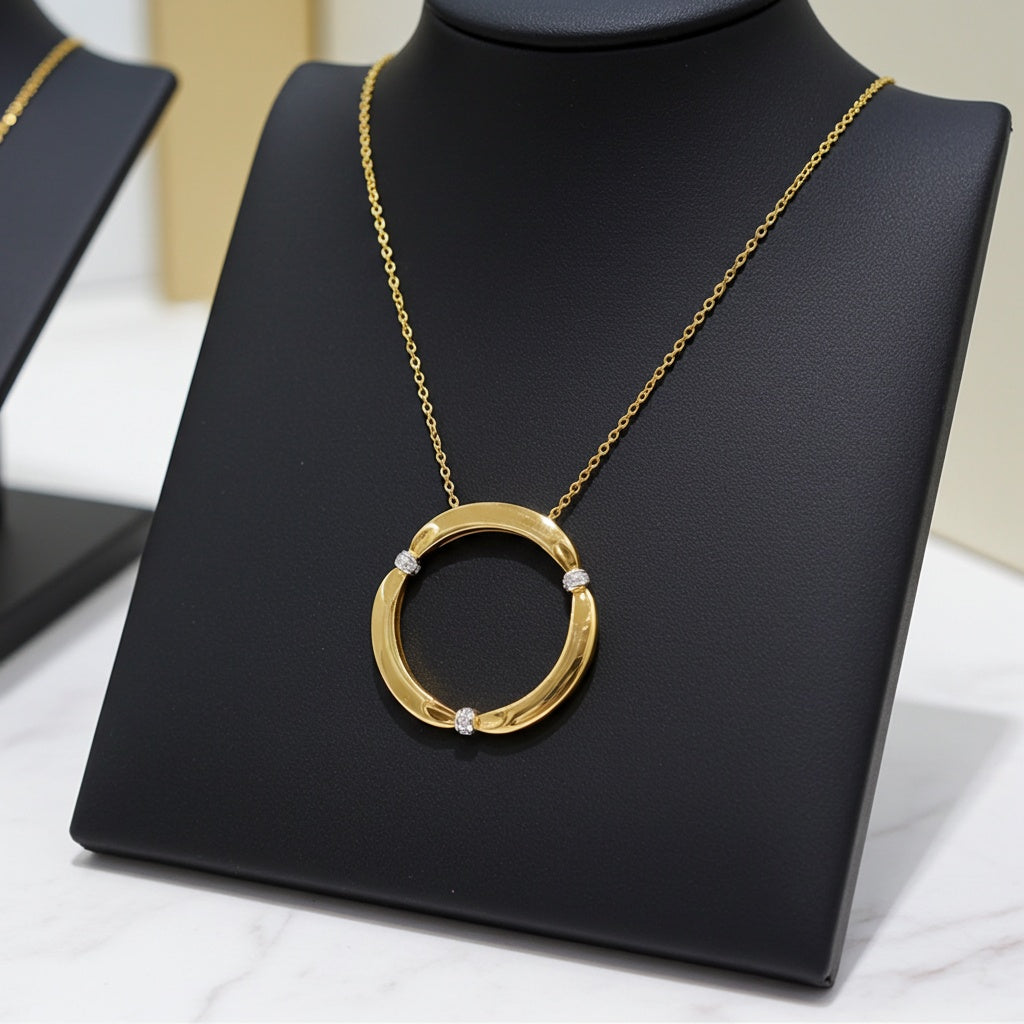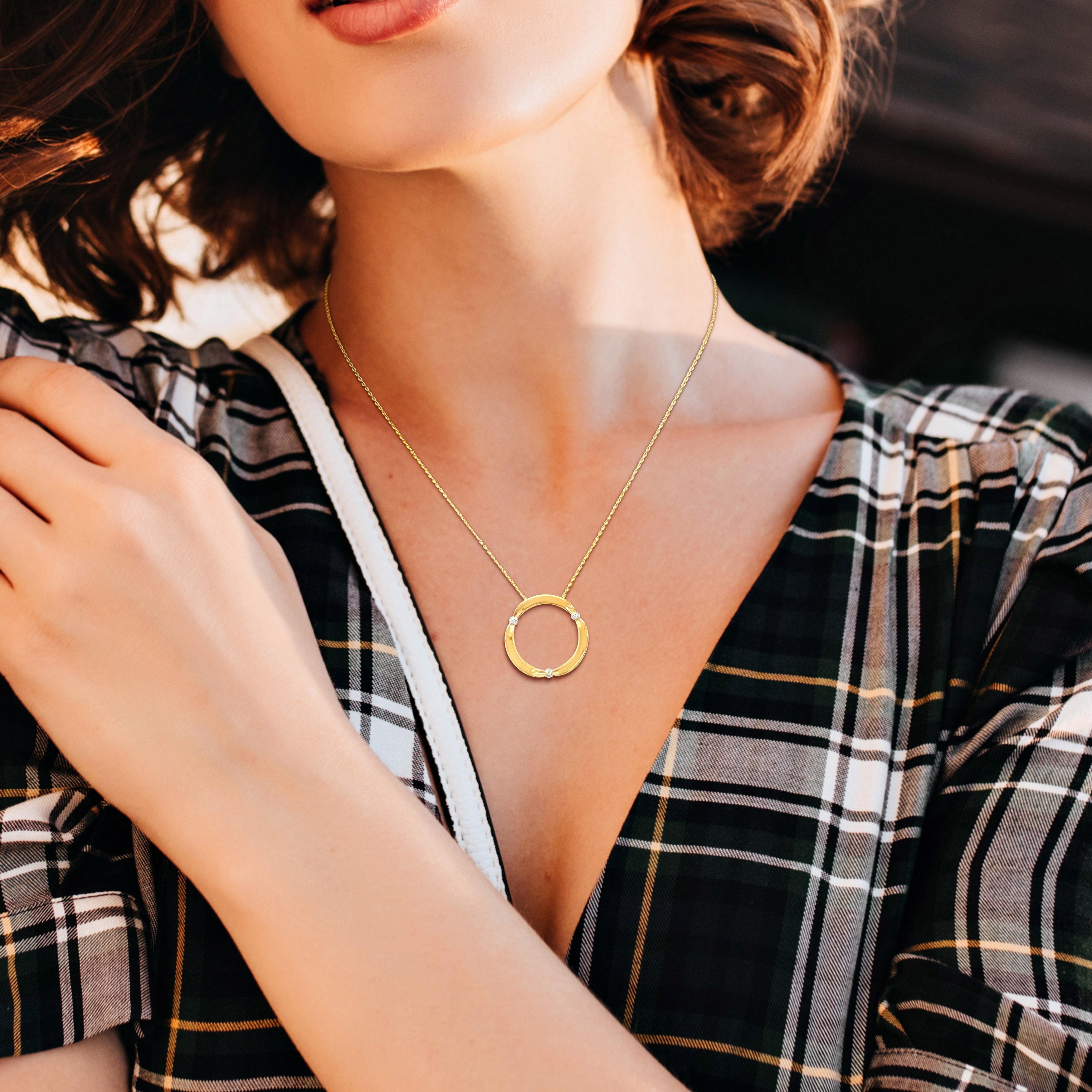 This necklace showcases an open circle station necklace adorned with diamond accents, meticulously crafted in 14k yellow gold and accompanied by an 18-inch chain. The open circle design adds a touch of elegance and style to the necklace, making it a versatile and fashionable accessory suitable for various occasions. The use of 14k yellow gold provides a warm and timeless backdrop for the diamond accents, creating a cherished and valuable addition to your jewelry collection.