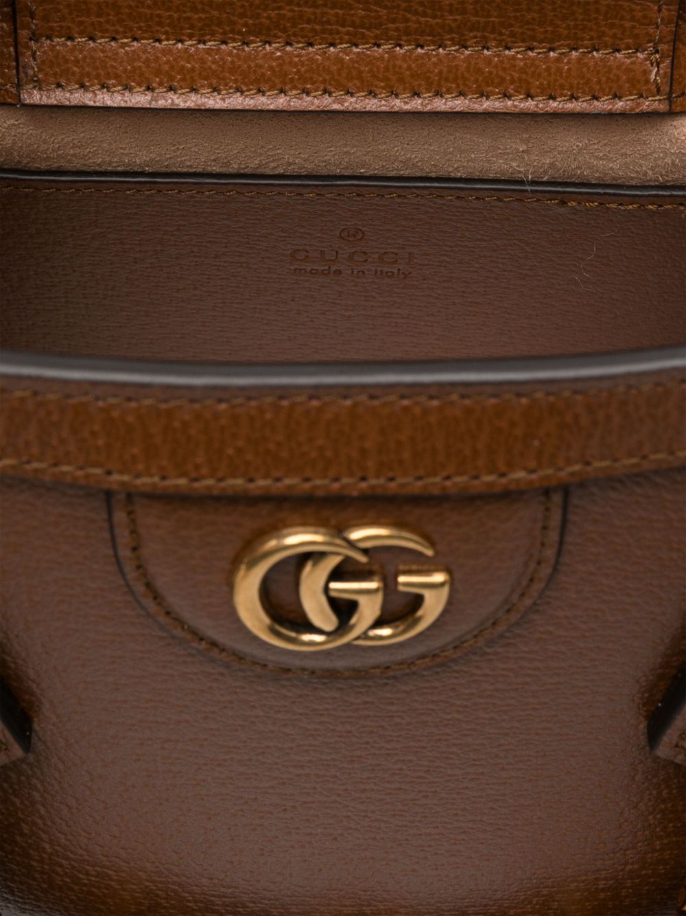 Crafted from premium leather in a rich brown tone, this structured bag showcases the distinctive GG logo hardware and elegant leather charm details. The compact size makes it perfect for carrying your essentials while maintaining a polished, refined aesthetic.
