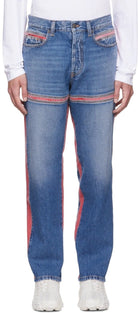 Regular style with regular waist and straight leg, enriched by link details on the sides. Inspired by archival designs, this medium-blue pair features link details in contrasting red fabric, cut and stitched on the fix denim to create the distinctive look and feel. The final wash confers a natural lived-in look.