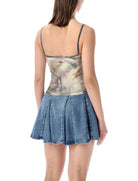 FEATURING SPAGHETTI STRAPS AND AN ALL-OVER CAMOUFLAGE-INSPIRED PRINT, IT IS DETAILED WITH CONTRAST EXTERNAL COVERSTITCHING AND SCATTERED TRANSPARENT CRYSTALS FOR A WATER-DROP EFFECT.
