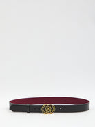 SMOOTH BLACK LEATHER BELT WITH ANCORA RED INTERIOR. FEATURES AN ENAMELLED ANTIQUE GOLD GG CROSS BUCKLE. ADJUSTABLE DESIGN