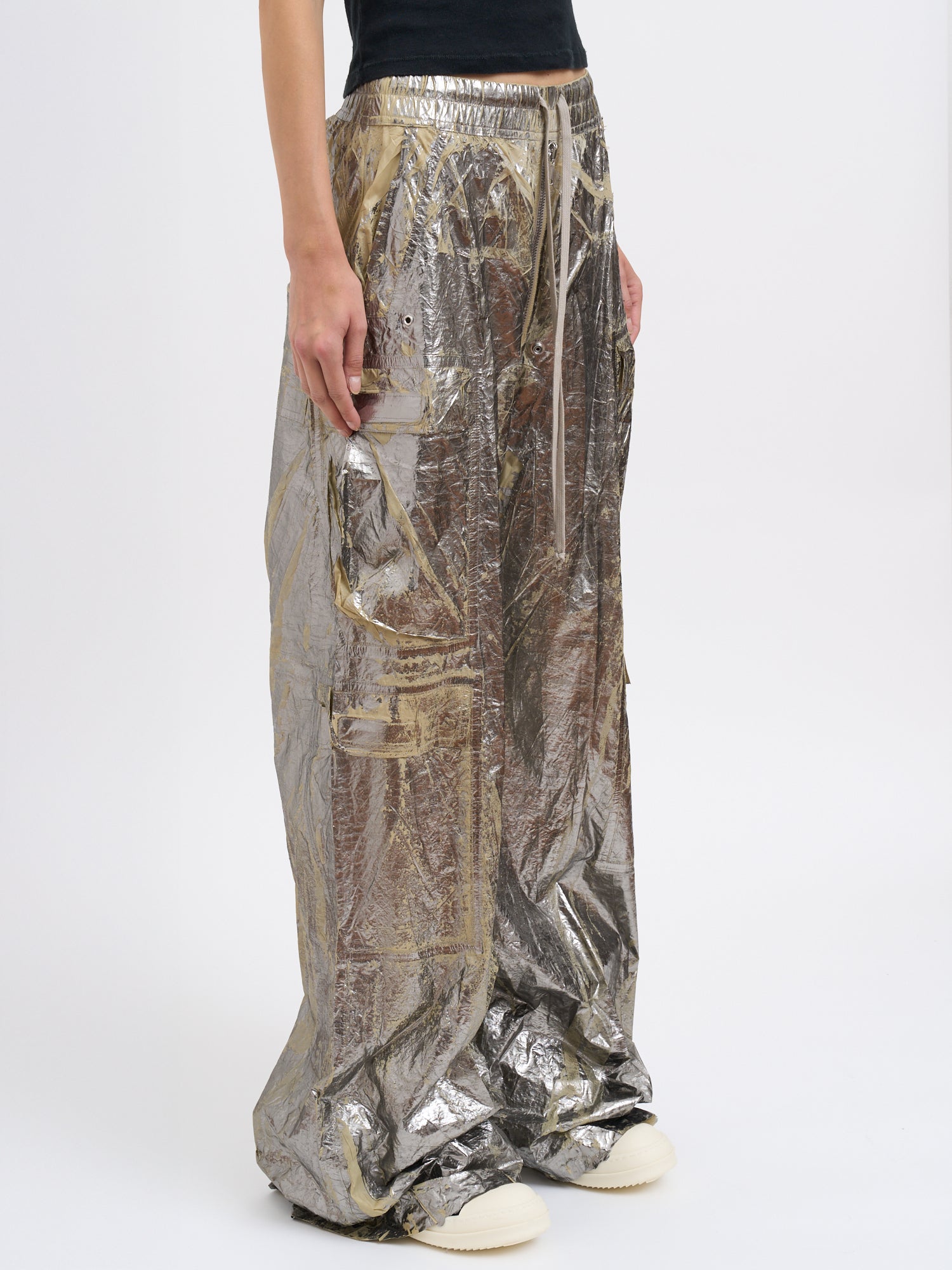 Make a bold statement with the DRKSHDW Double Cargo Jumbo Pants in striking palladium metallic finish. These avant-garde pants feature an oversized, relaxed silhouette with functional cargo pockets and an adjustable drawstring waist for customizable comfort.
