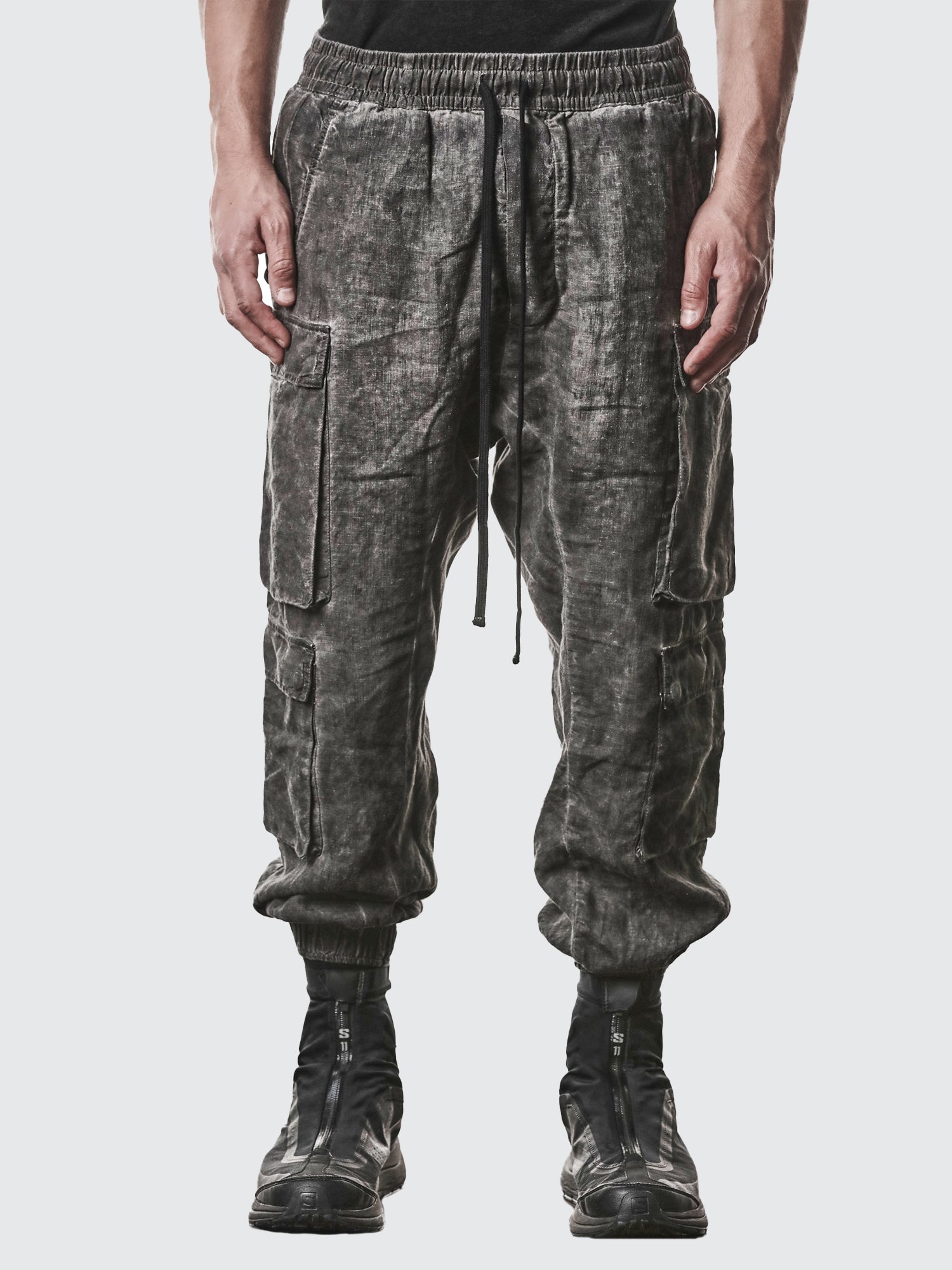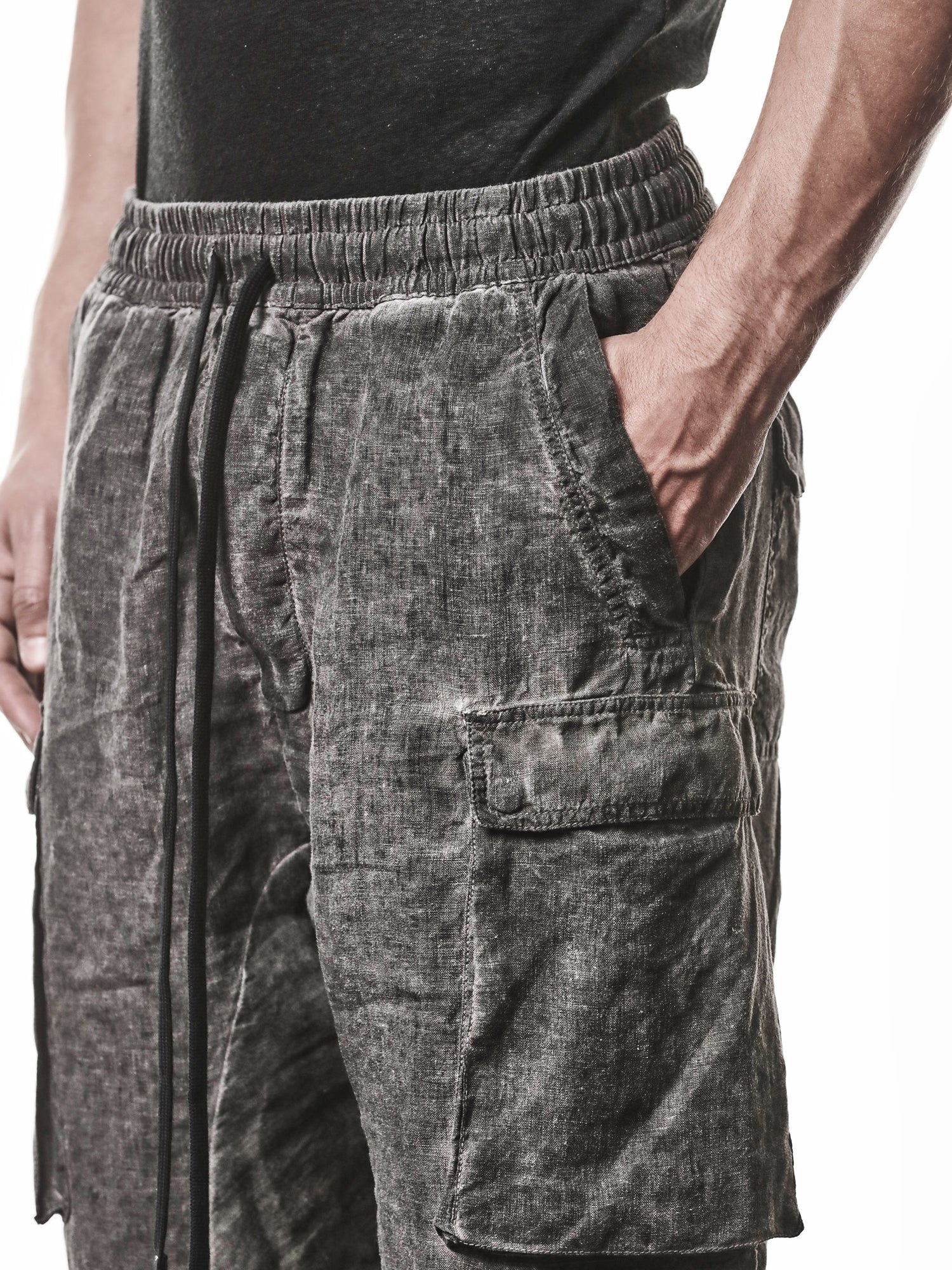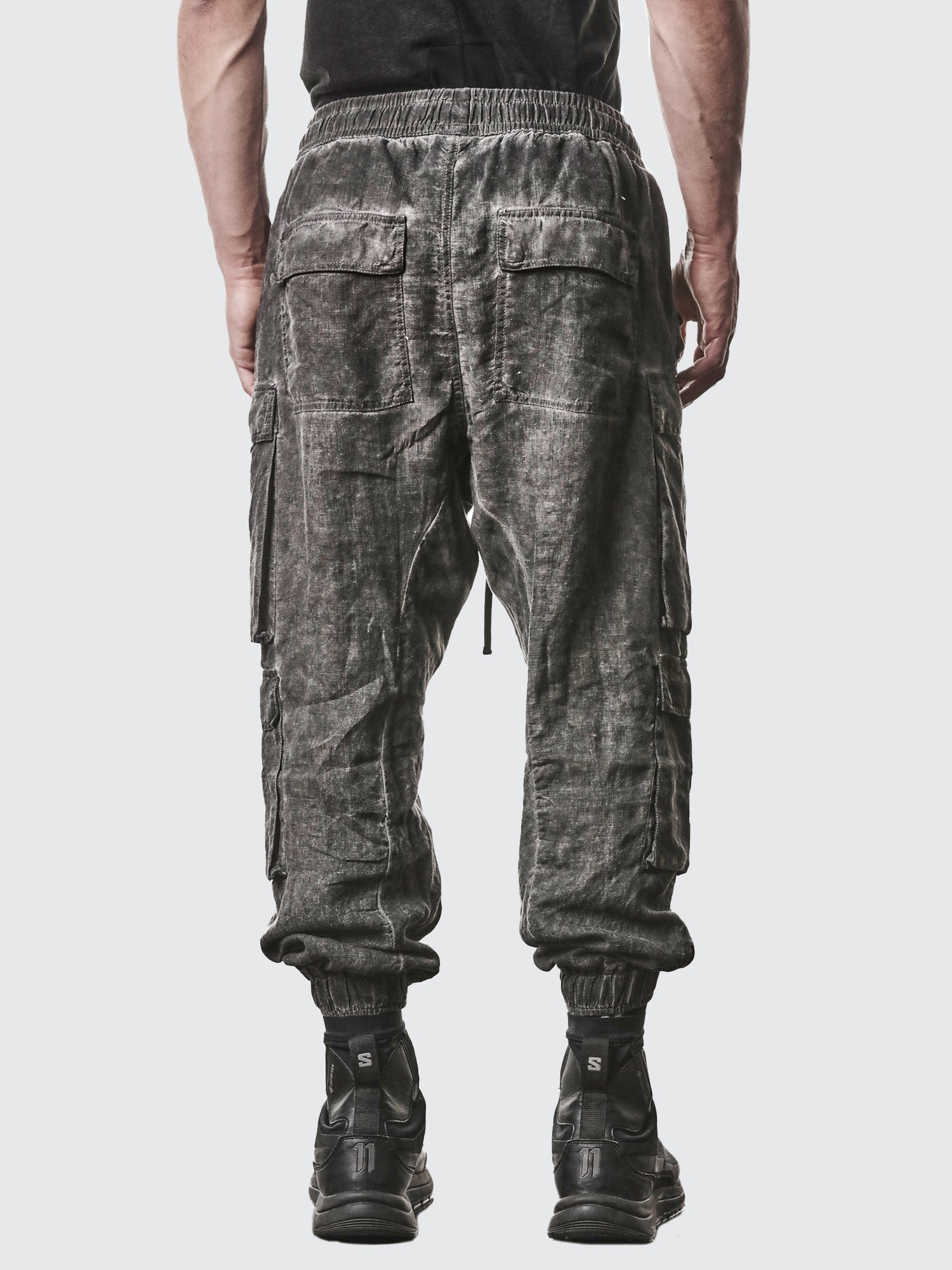 Elevate your streetwear game with these Double Cargo Linen Trousers from THOM KROM. Crafted from premium linen, these trousers feature a distinctive dropped crotch silhouette and dual cargo pockets for a utilitarian edge.