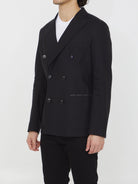 Double-breasted stretch jacket in black linen, viscose and cotton blend. It features peaked lapels, front six-button closure, two front patch pockets, a welt pocket on chest and buttoned cuffs.