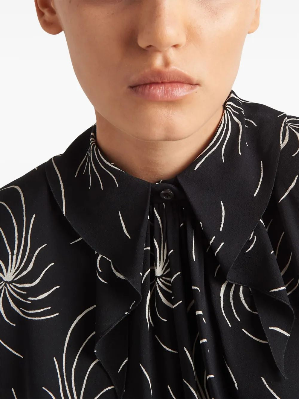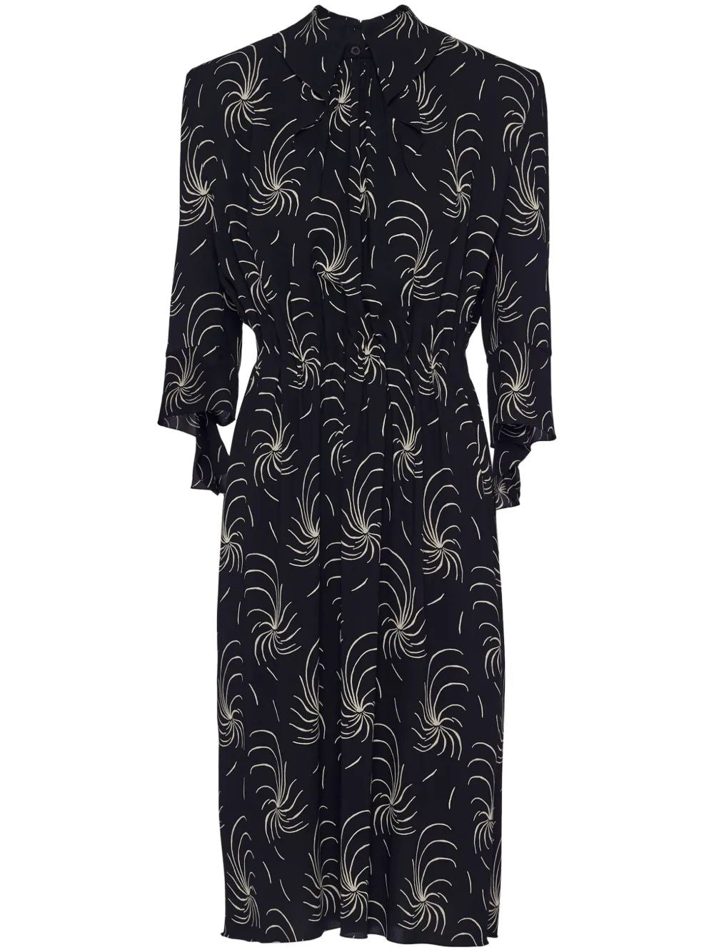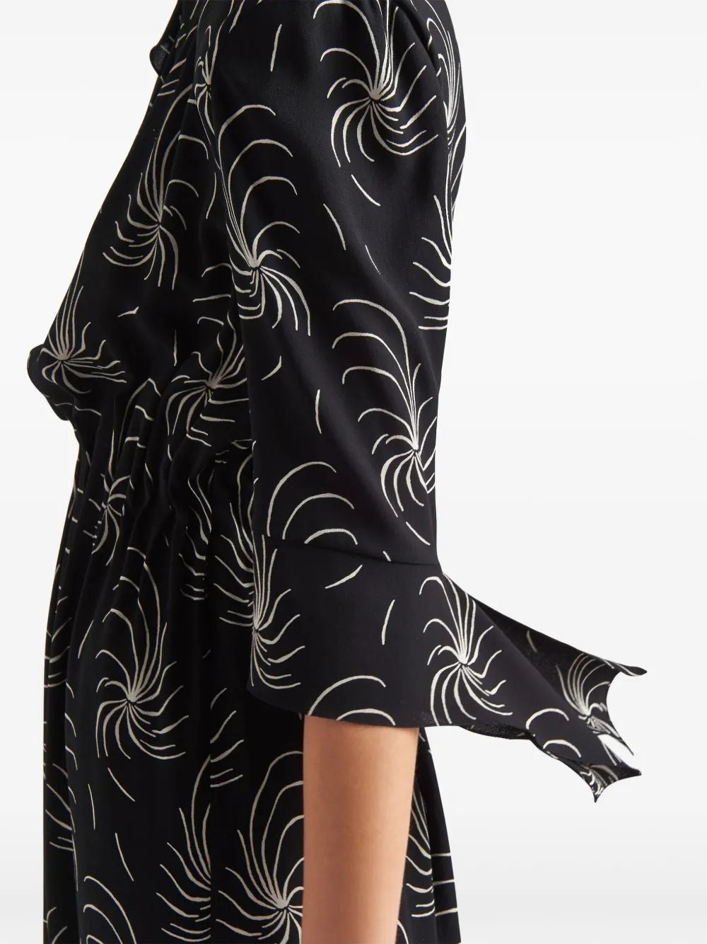 This elegant Prada midi dress features a sophisticated black base adorned with an eye-catching swirl pattern throughout. The flattering silhouette is enhanced by 3/4 length sleeves and a refined mock neckline, creating a timeless and versatile piece.