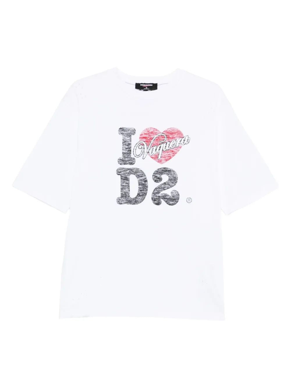 Make a statement with this exclusive DSQUARED2 X VAQUERA cotton t-shirt featuring a bold graphic design. The playful "I Love Vaquera D2" print with distressed lettering and pink heart detail adds a contemporary edge to this wardrobe essential.