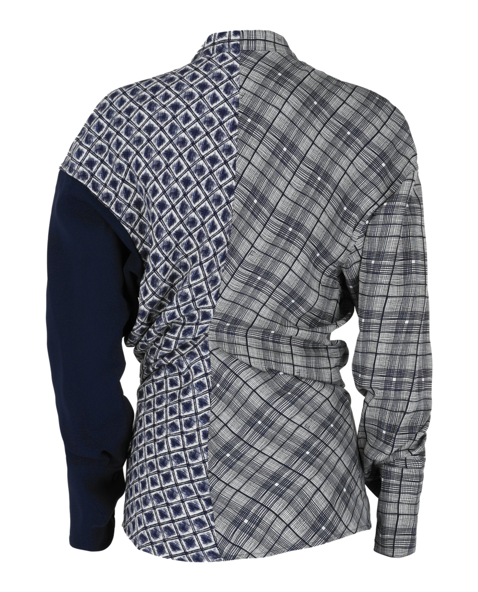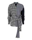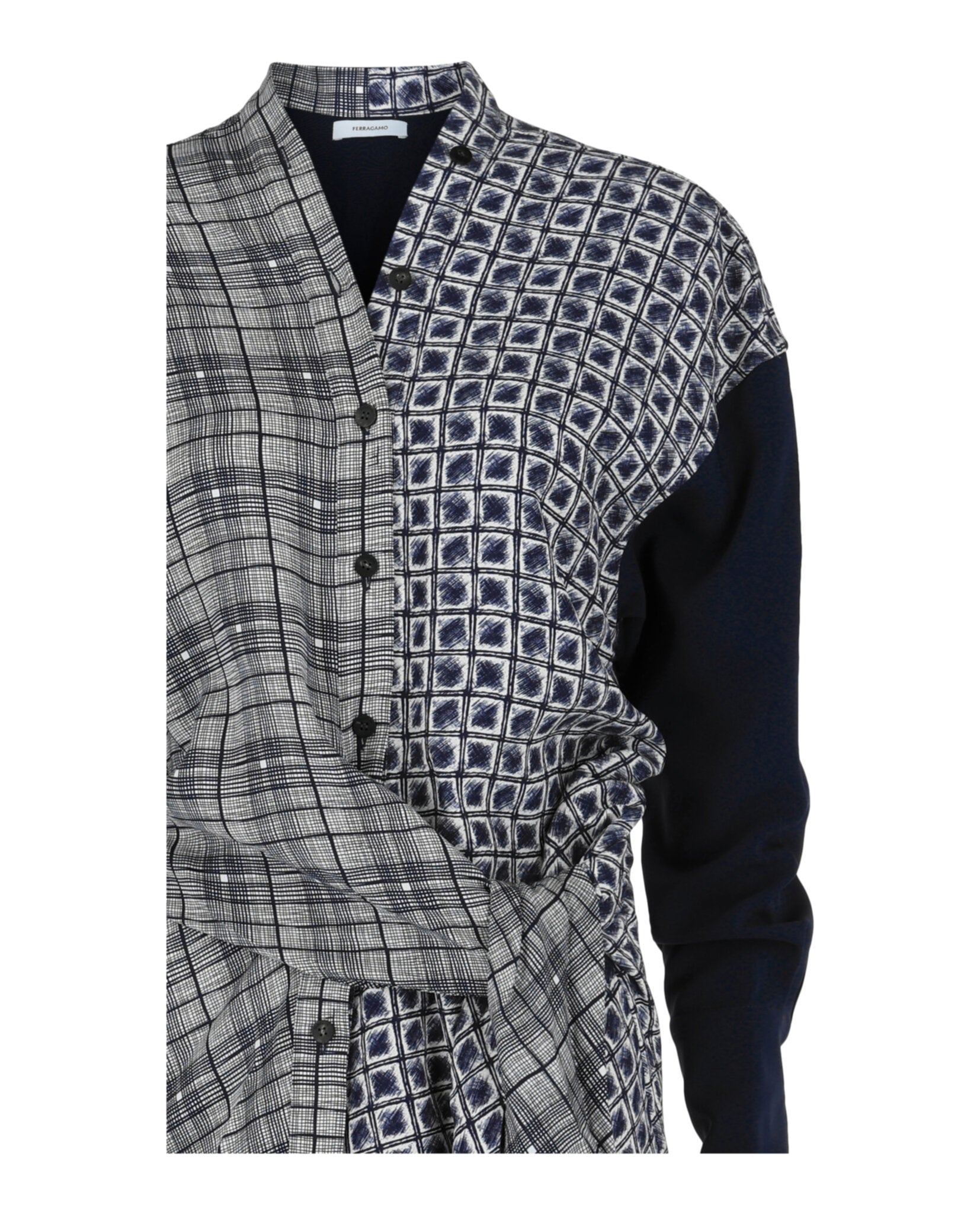 Make a statement with this stunning Dual Printed Shirt from Ferragamo. This sophisticated blouse features an eye-catching mix of blocked patterns—plaid on one side and geometric print on the other—creating a unique asymmetric design that's both modern and refined.
