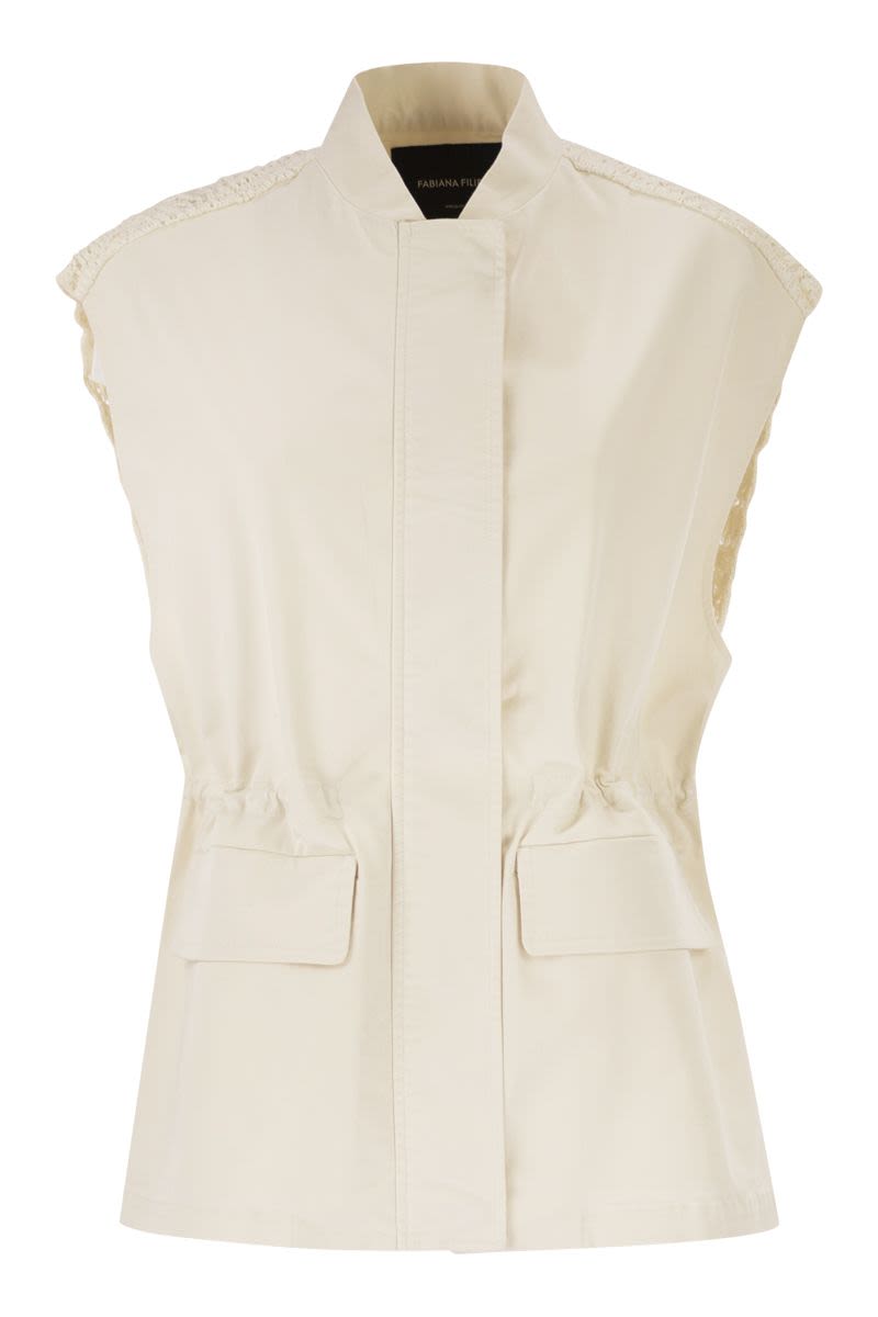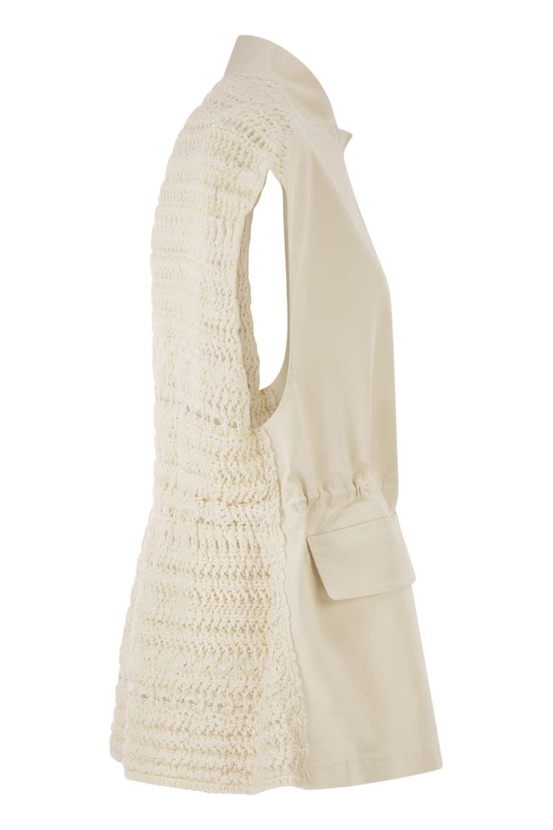 THIS REFINED WAISTCOAT BY FABIANA FILIPPI COMBINES THE STRUCTURED ELEGANCE OF STRETCH COTTON POPLIN ON THE FRONT WITH SOPHISTICATED KNITWORK ON THE BACK. THE DESIGN IS EMBELLISHED WITH A PLAY OF TEXTURES THAT BLENDS LINEN, VIRGIN WOOL AND COTTON, CREATING A UNIQUE MATERIAL CONTRAST. FEATURING A PRACTICAL INTERNAL DRAWSTRING AT THE WAIST TO ADJUST THE SILHOUETTE, THE GARMENT IS FINISHED WITH A STAND-UP COLLAR AND A COVERED FASTENING, PERFECTLY EMBODYING THE DISCREET LUXURY OF MADE IN ITALY. - STRETCH COTTON POPLIN FRONT - MULTI-COMPONENT OPENWORK KNIT BACK - ADJUSTABLE INTERNAL DRAWSTRING AT THE WAIST - FRONT ZIP CLOSURE WITH COVERED FLAP - FRONT POCKETS WITH FLAPS - HIGH STAND-UP COLLAR DESIGNER ID: CTD266F217L932 0145