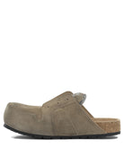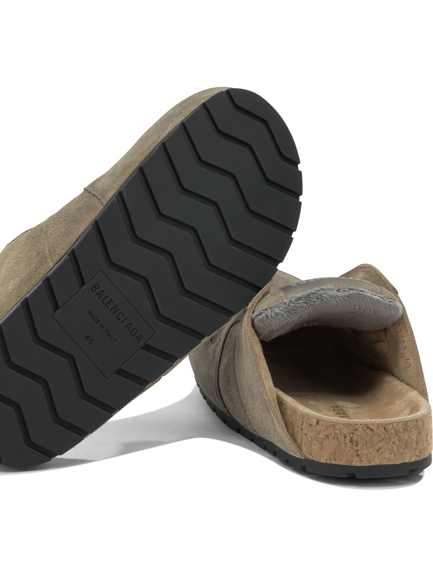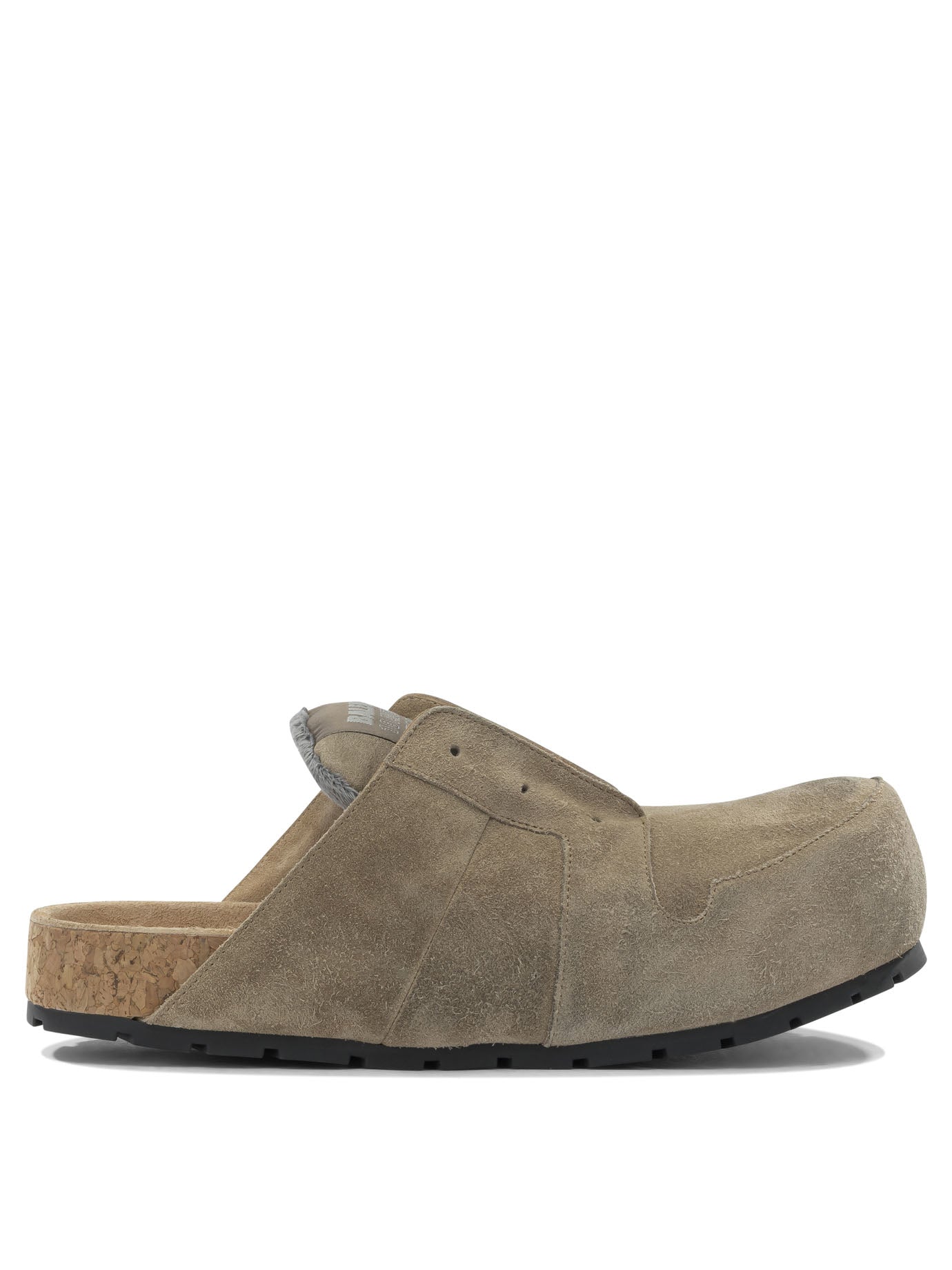 Balenciaga "Dumbo" sabot made of suede calfskin leather, featuring a worn effect on the surface. The structure features a lace-free silhouette with a round toe and exposed tone-on-tone topstitching. The sole is covered in cork with a black synthetic base. On the tongue, Balenciaga logo patch and 10 AV George V Paris address. Calfskin leather insole.