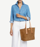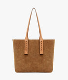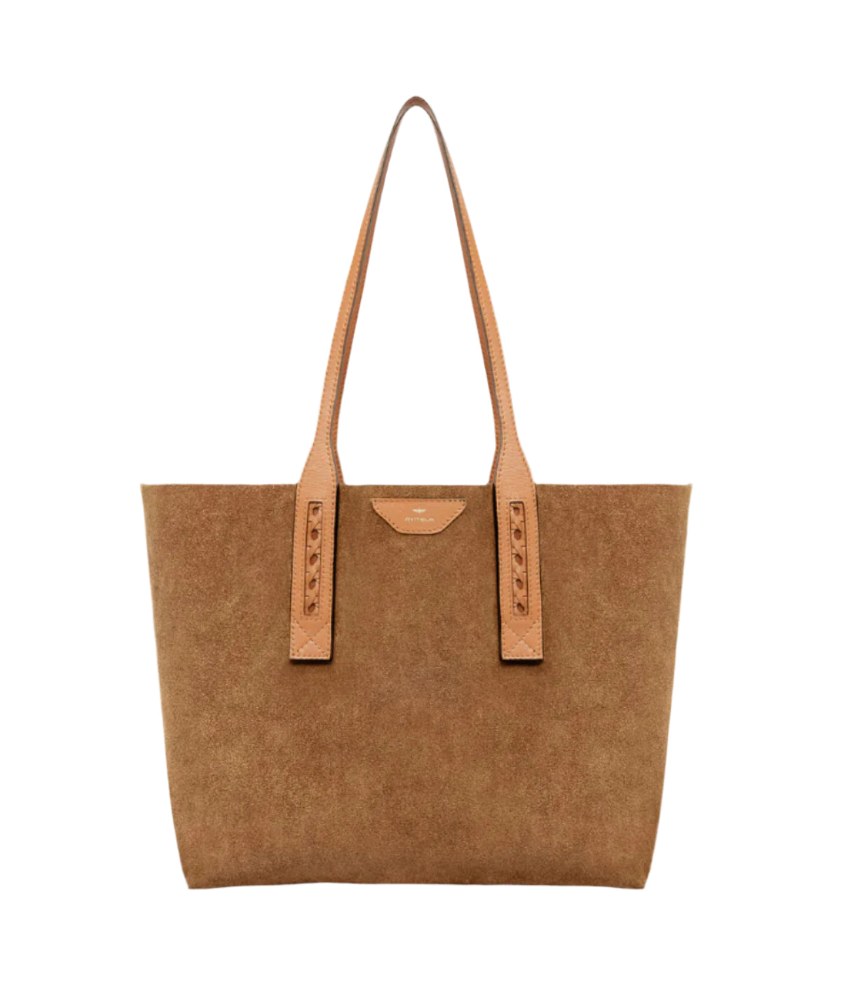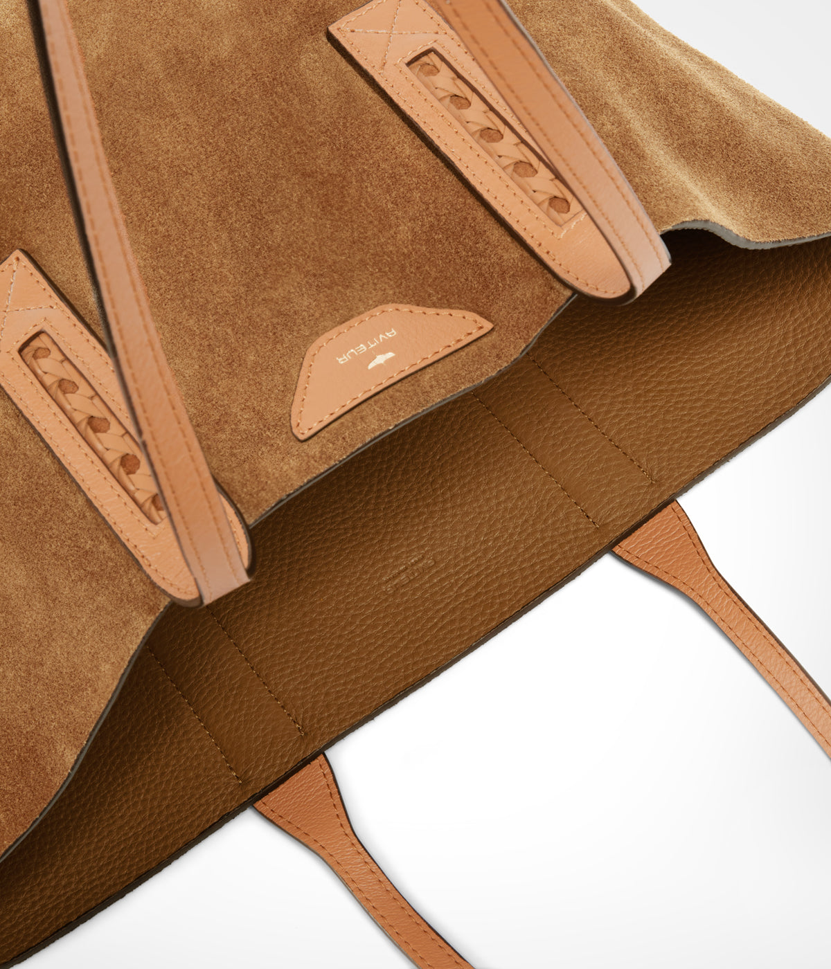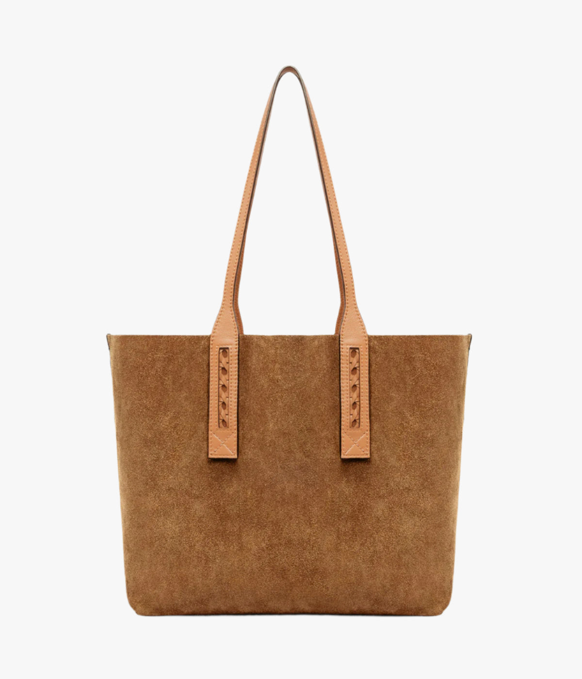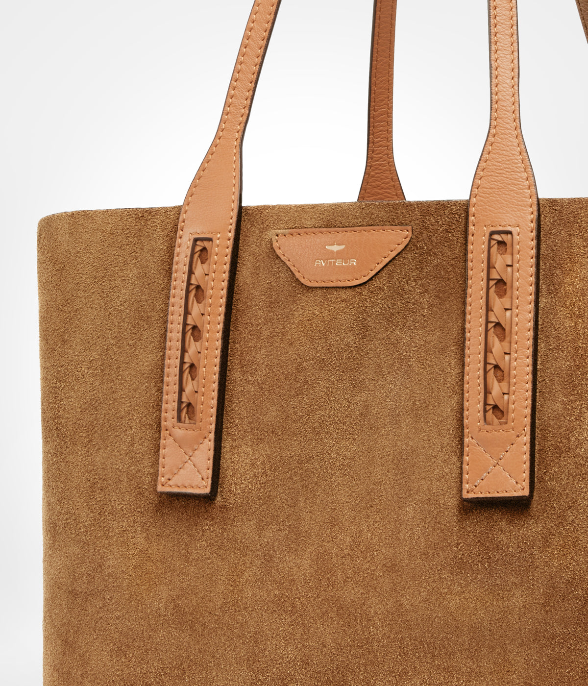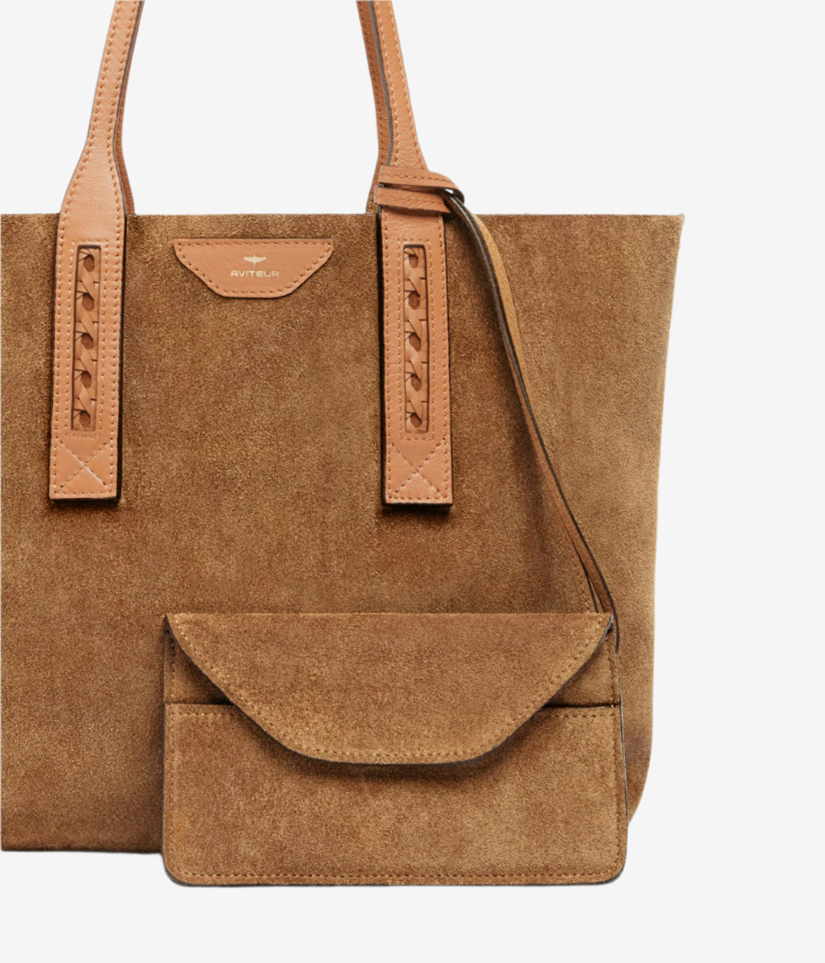 Tote Bag in suede with detachable suede pouch, handle with signature weave.