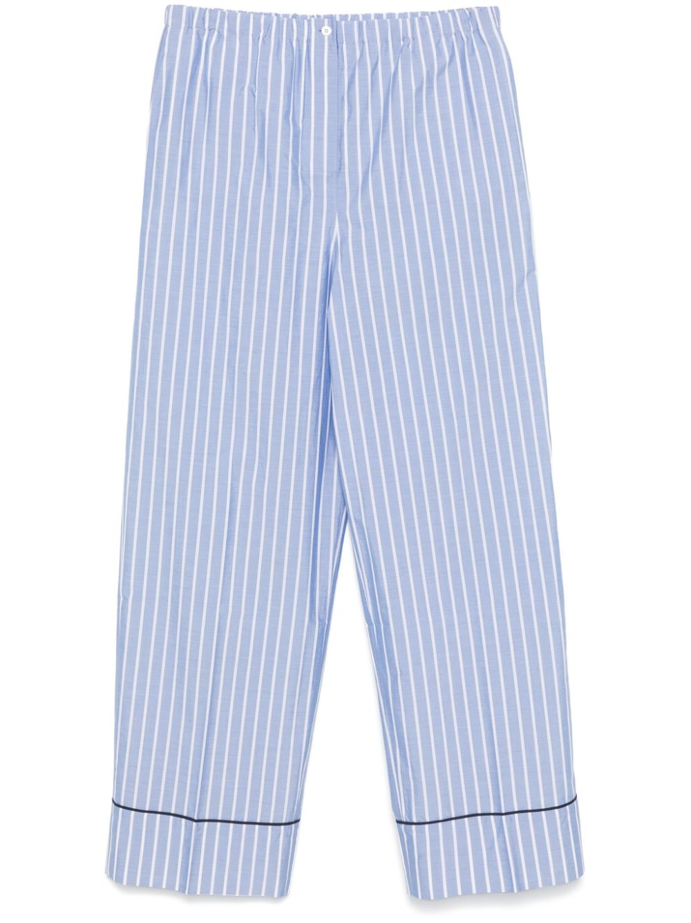 Elevate your sleepwear collection with these luxurious striped pajama pants from Prada. Crafted in a refreshing light blue and white stripe pattern, these pants feature a sophisticated front button placket and an elasticated waistband for ultimate comfort.