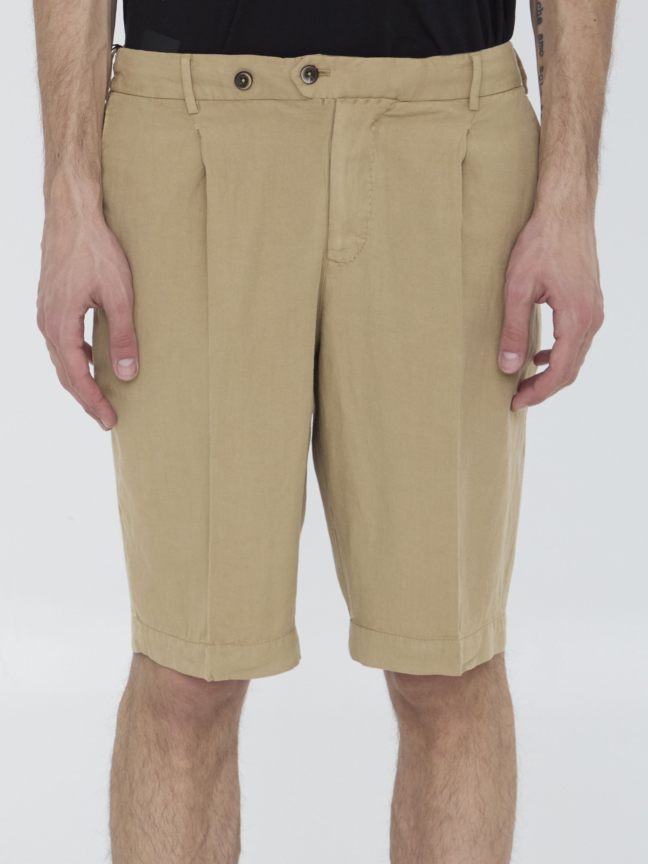 Bermuda shorts in beige lyocell, linen and cotton blend. It features elasticated waistband, zip and button closure, drawstring at waist, two side welt pockets, two rear buttoned flap pockets and belt loops. Regular fit.