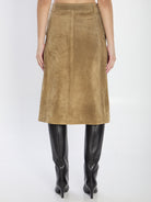 Midi skirt in olive green suede leather. Featuring front snap-button closure, belt loops, and side welt pockets. Regular fit.