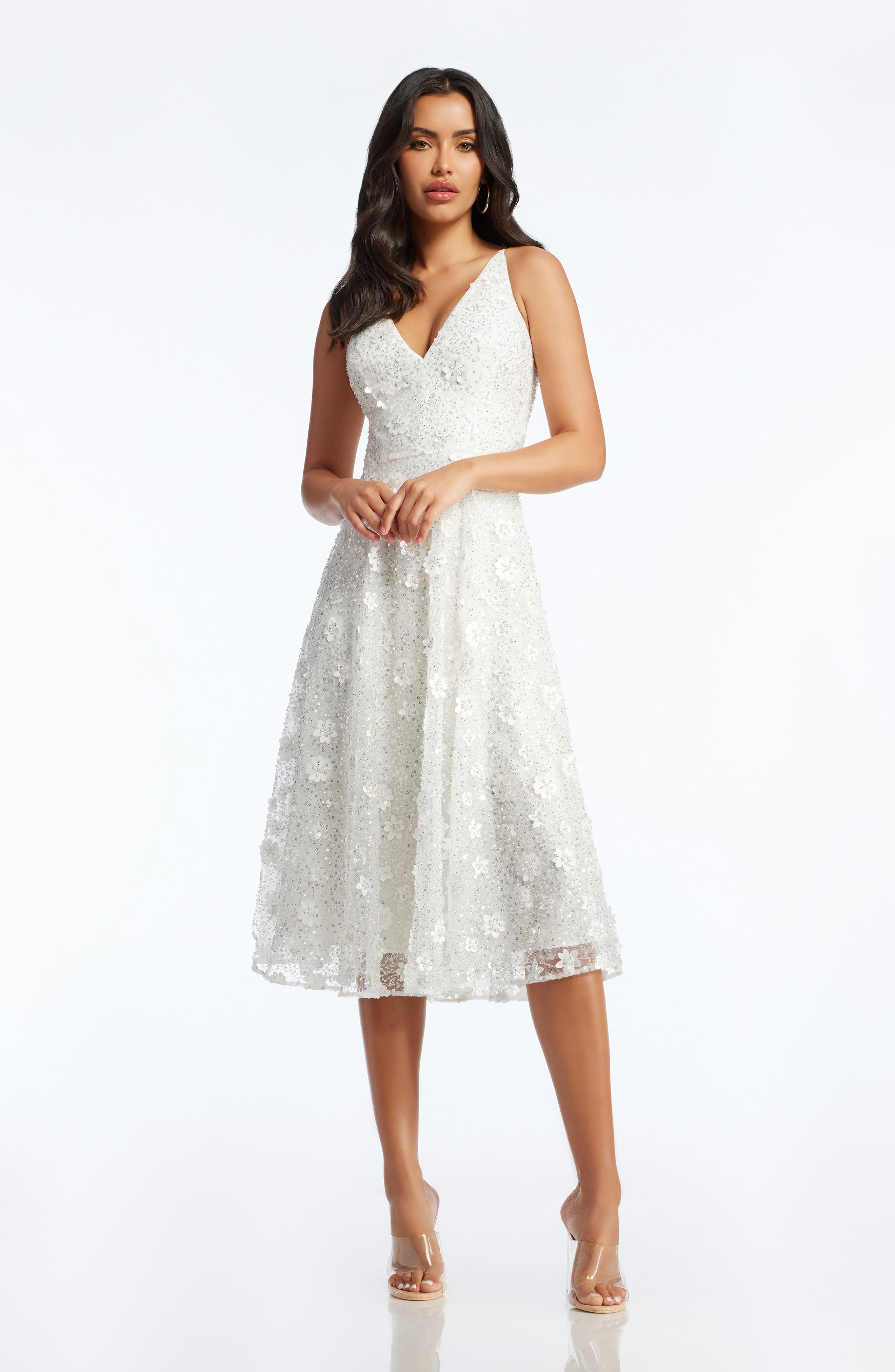 You're sure to turn heads in this gorgeous dress. Elisa features top-to-bottom floating floral appliques and sequins. With a sleeveless, form-fitting bodice and a plunging neckline in the front and back, this dress will flatter your figure. The fit and flare silhouette is complemented by a mesh-lined, cocktail-length skirt.