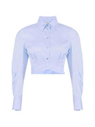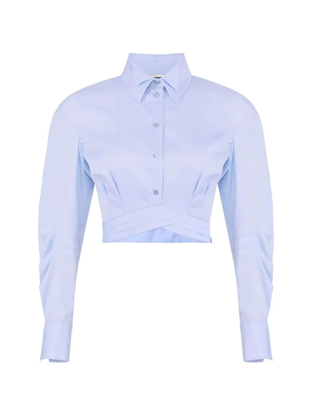Elevate your wardrobe with the Elisabetta Franchi Double-Collar Cropped Shirt in a fresh sky blue hue. This sophisticated piece features a distinctive double collar design, classic button-front closure, and a modern cropped silhouette with an elegant twisted waist detail.