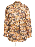 This camouflage-printed cotton jacket features functional pockets, a dual zip and button closure, and adjustable drawstrings at both the waist and bottom hem for a customizable fit. The long sleeves and relaxed silhouette make it perfect for layering over everything from casual tees to elegant knits.