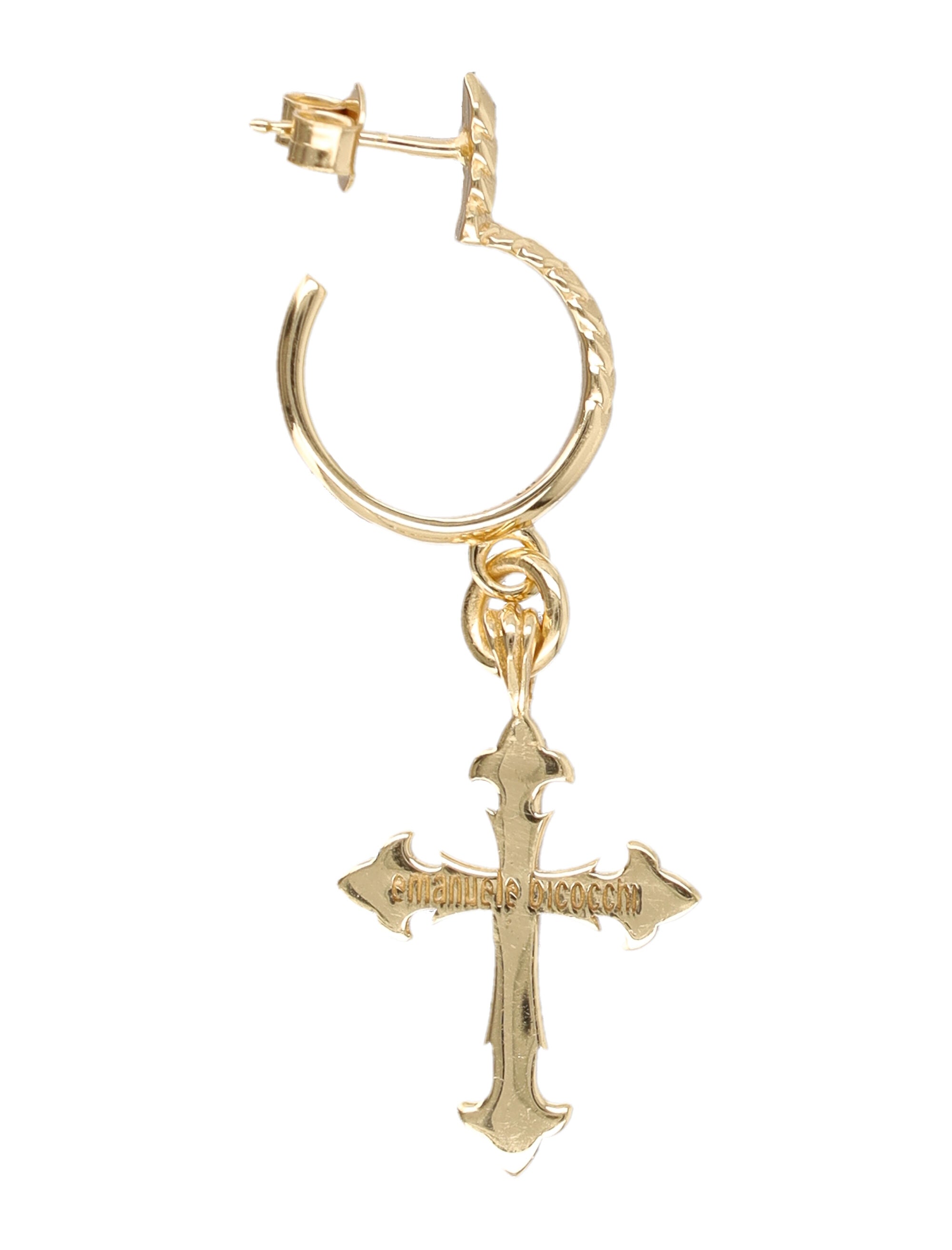 A STRIKING JEWEL, THIS SINGLE EARRING BY EMANUELE BICOCCHI IS CRAFTED FROM GOLD-PLATED STERLING SILVER AND ENRICHED WITH AN AVELLI CROSS PENDANT.