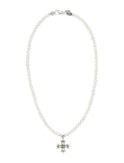 A REFINED JEWEL, THIS EMANUELE BICOCCHI NECKLACE COMBINES THE TIMELESS ELEGANCE OF FRESHWATER PEARLS WITH A STERLING SILVER CROSS PENDANT.