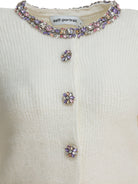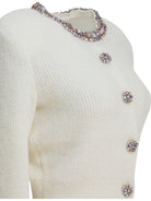Elevate your knitwear collection with this exquisite Embellished Wool-Blend Cardigan from Self-Portrait. Crafted in a luxurious cream wool blend, this cropped cardigan features stunning crystal and jewel embellishments along the neckline and decorative button closures, adding a touch of glamour to any ensemble.