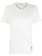 WHITE COTTON JERSEY TEXTURE CREW NECK RHINESTONE EMBELLISHMENT SHORT SLEEVES LOGO PATCH TO THE REAR STRAIGHT HEM
