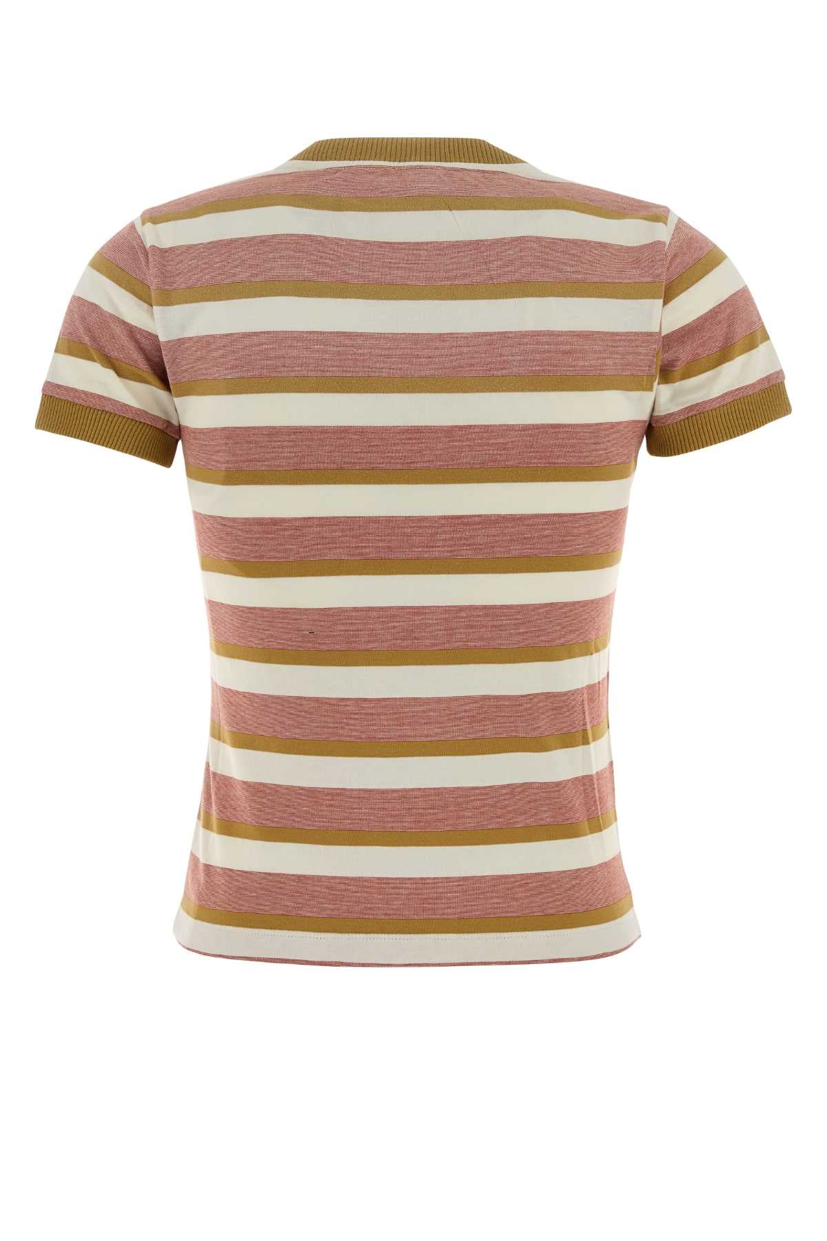 Elevate your everyday wardrobe with this Embroidered Cotton T-Shirt from Prada. Crafted from soft jersey cotton, this classic tee features charming horizontal stripes in a sophisticated palette of mauve, cream, and olive tones.